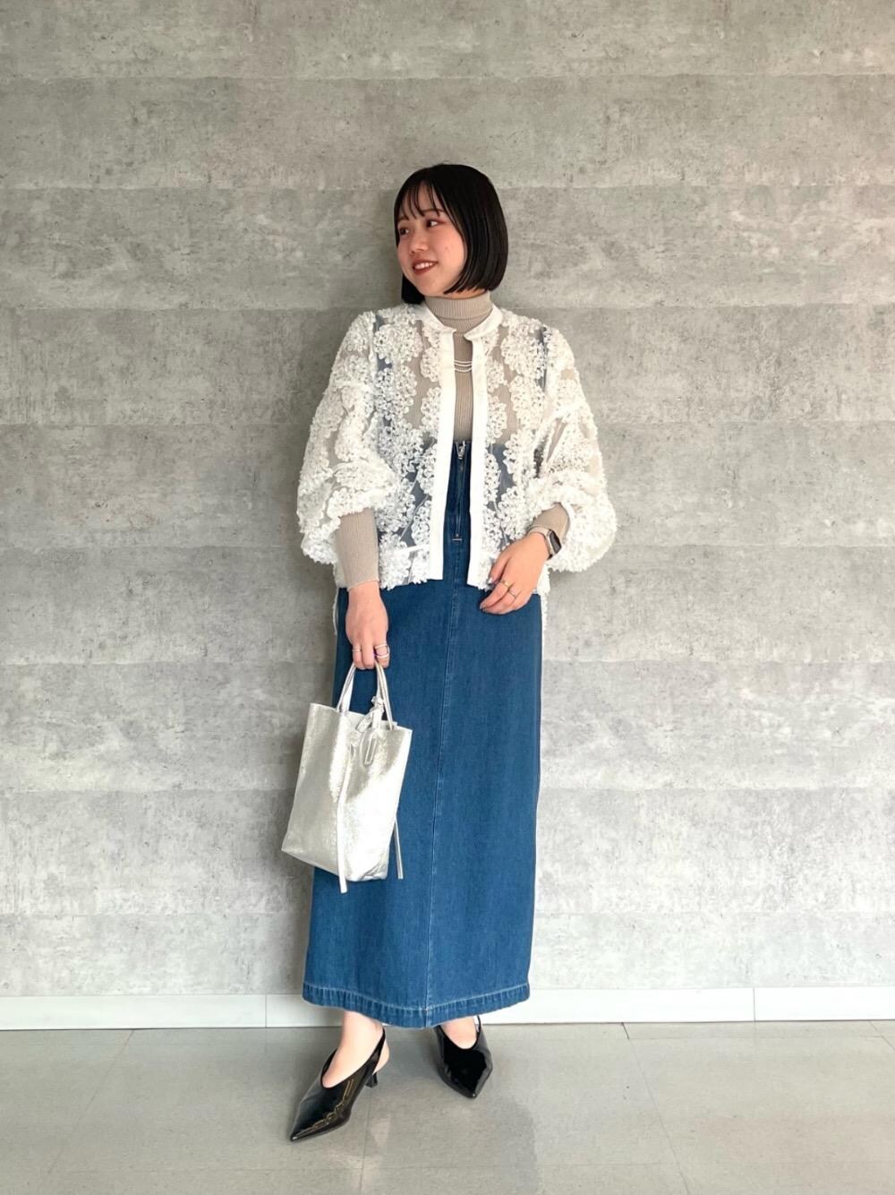 20代後半/158cm/骨格ストレート/普段サイズM/着用サイズ トップス38ボトム38 【リブタートルニット】 サイズ感 : 全体的にコンパクトめで、体に沿うようなサイズ感。 素材感: 薄手で柔らかく伸縮性があるニット素材。 着用感: 優しくフィットするので楽な着心地。首元まで暖かいです◎ 【TORRAZZO DONNAエンブロイダリーレースブラウス】 サイズ感 : ゆったりとしたサイズ感。裾は前後差があり後ろはヒップが隠れる丈感です。 素材感: 繊細なシアー素材。 着用感: 透け感がありインナー次第で長く着回せます。ボリューム袖で女性らしいシルエットです。 【デニムサロペットスカート】 サイズ感 : 身幅はスッキリめ。丈はストラップで調整できます。 素材感:ソフトなデニム素材。 着用感: スッキリしたシルエットで華奢見えします。シーズンレスで長く着回せます◎