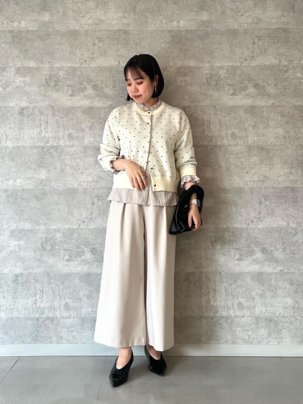 20代後半/158cm/骨格ストレート/普段サイズM/着用サイズ トップス38ボトム38 【ドットジャガードニットカーディガン】 サイズ感 : 身幅はゆったりめで、丈感はコンパクトめです。 素材感: 軽くてもちっとしたニット素材。 着用感: さらっとした肌触りで春先まで着まわせそうです。細かいドット柄がクラシカルで大人可愛いデザイン。 【パウダーサテンシャーリング長袖ブラウス】 サイズ感 : 程よいゆとりがあります。 素材感: なめらかでシワが気になりにくい素材感。 着用感: 落ち感があり着膨れずスッキリした印象です。シーズンレスで長く着まわせます。 【ウールライクウエストデザインワイドクロップドパンツ】 サイズ感 : 38サイズで全体的にゆったりめ。クロップド丈なのでスッキリした印象。 素材感: 程よい厚みのシワになりにくい素材感。 着用感: 体のラインを拾わないぐらいにゆとりがありきれいなワイドシルエットで着心地も楽です。