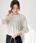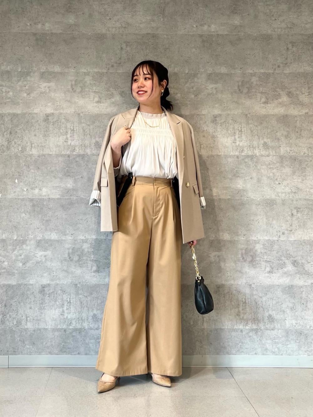 20代後半/158cm/骨格ストレート/普段サイズM/着用サイズ トップス38ボトム38 【パウダーサテンフロントシャーリングブラウス】 サイズ感 : 程よくゆとりがあります。落ち感がある素材でスッキリした印象。 素材感: なめらかでシワが気になりにくい素材感。 着用感: 胸元のギャザーが女性らしく華やか。肌触りもサラッとしていて長いシーズンで使えそうです。 【ダブルブレストジャケット】 サイズ感 : 身幅にゆとりがあります。 素材感: 程よい厚みでなめらかな素材感。 着用感: 落ち感がありスッキリしたシルエットです。程よくゆったりめでカチッとしすぎずカジュアルにも合わせやすいです。 【サスペンダー付タックワイドパンツ】 サイズ感 : ウエストもゆったりめですが、サイドのボタンで調整できます。 素材感: さらっとしていて落ち感があります。 着用感: 広がりすぎないワイドシルエットでスタイルアップします。取り外しできるサスペンダーもワンポイントになります◎