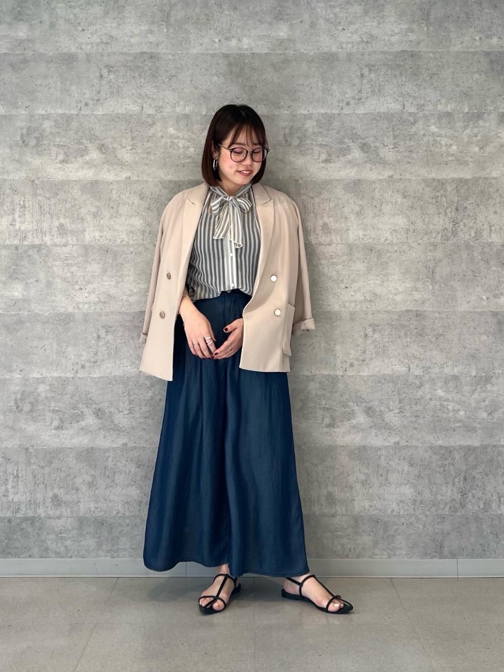 20代後半/158cm/骨格ストレート/普段サイズM/着用サイズ トップス38ボトム38 【楊柳シアーストライプボウタイブラウス】 サイズ感 : 程よくコンパクトめ。ヒップにかかる丈感です。 素材感: 薄手で透け感あり。シワが気になりにくい素材感。 着用感: 首元のボウタイがワンポイントになり華やかです。フレンチスリーブで腕もカバーしてくれます。 【ツータックワイドクロップドデニム】 サイズ感 : 38サイズで全体的に程よいゆとりがあります。足のくるぶしが見えるぐらいの丈感。 素材感: 薄手でなめらか。落ち感があります。 着用感: ワイドシルエットで体のラインも気になりにくいです。さらっとしていて肌触りもよく暑い時期にもぴったりです◎ 【メッシュダブルブレストジャケット】 サイズ感 : 全体的にゆとりがあります。腰回りにかかる丈感。 素材感: メッシュ素材で少し透け感があります。 着用感: とても軽くサラッとした肌触りで着心地◎暑い時期の日除けの羽織りなどにもおすすめです。
