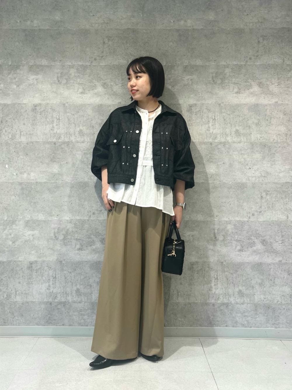 158cm/骨格ストレート/普段サイズM/着用サイズ トップス38ボトム38 【Fanaka ミックス刺しゅうレースブラウス】 サイズ感 : 全体的に程よくゆったりめ。 素材感: 薄手で柔らかい肌触り。 着用感: 柄の違う刺繍が華やかで大人可愛いデザイン。薄手で軽い着心地なので季節の変わり目にぴったりです。 【ライトデニムジャケット】 サイズ感 : 身幅はゆったりしていて丈はコンパクトめです。 素材感: 薄手で柔らかいデニム素材。 着用感: 軽くて窮屈感もなく楽な着心地。シャツ感覚で羽織れます。ボリュームスリーブでカジュアルすぎず女性らしい印象です。 【フルダルダブルタックワイドパンツ】 サイズ感 : ウエストはゴムで丁度いいです。丈は足の甲にかかるぐらいです。 素材感: ストレッチ性があり、シワが気になりにくいなめらかな素材感。 着用感: ゆったりしたワイドシルエットですが、なめらかな素材で落ち感があるのでスッキリ見えします◎