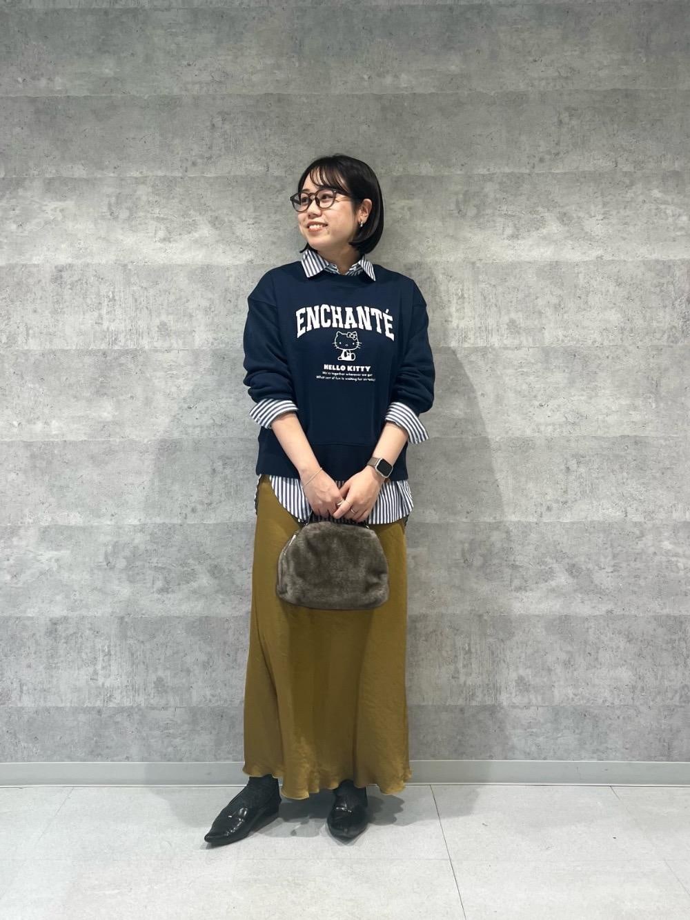 158cm/骨格ストレート/普段サイズM/着用サイズ トップス38ボトム38 【レギュラーカラーオーバーシャツ】 サイズ感: 全体的にゆったりしています。 素材感: 薄手。程よくハリのある素材感。 着用感: 1枚でもレイヤードでも着映える万能アイテム。長いシーズンで着回せそうです。 【【HELLO KITTY】カレッジロゴスウェット】 サイズ感 : 体のラインが目立たない程度のゆとりがあります。 素材感: 程よい厚みで落ち感のある素材感。 着用感: 生地が柔らかいので着心地がいいです。 【マットサテンナロースカート】 サイズ感 : ウエストはゴムでゆったりめ。腰回りもラインを拾わない程度にゆとりがあります。 素材感: サテン素材でシワが気になりにくい。 着用感: 光沢感が華やかで女性らしく着映えます。スッキリしたシルエットですが足捌きもよく動きやすいです。