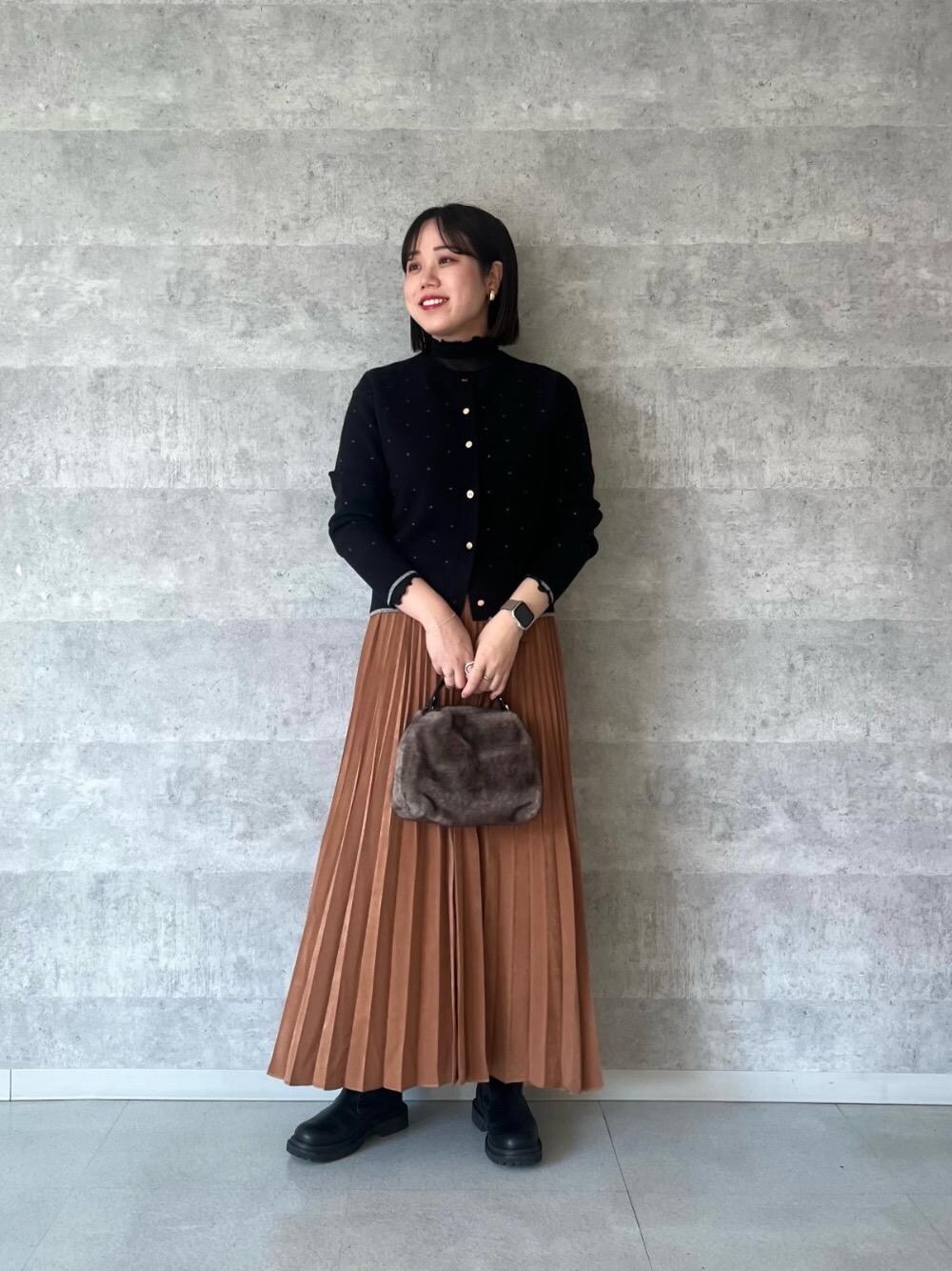 158cm/骨格ストレート/普段サイズM/着用サイズ トップス38ボトム38 【シアータートル】 サイズ感: 全体的にコンパクトめ。 素材感: 伸縮性のある柔らかい素材感。 着用感: 柔らかい肌触りで窮屈感もなく着心地◎ベストやニットなどにレイヤードするだけでオシャレ見えします。 【ラメドットジャガードカーディガン】 サイズ感 : コンパクトめですが、体のラインは目立たないです。 素材感: 程よい厚みの柔らかいニット素材。 着用感: 肌触りも良く暖かいです。コンパクトな丈感でスカート、パンツ問わず合わせやすいです◎ 【マロンサテン変形プリーツスカート】 サイズ感 : ウエストは総ゴムでゆったりめ。足首が見える丈感。 素材感: ソフトな肌触り。なめらか。 着用感: 広がりすぎずスッキリめのシルエット。