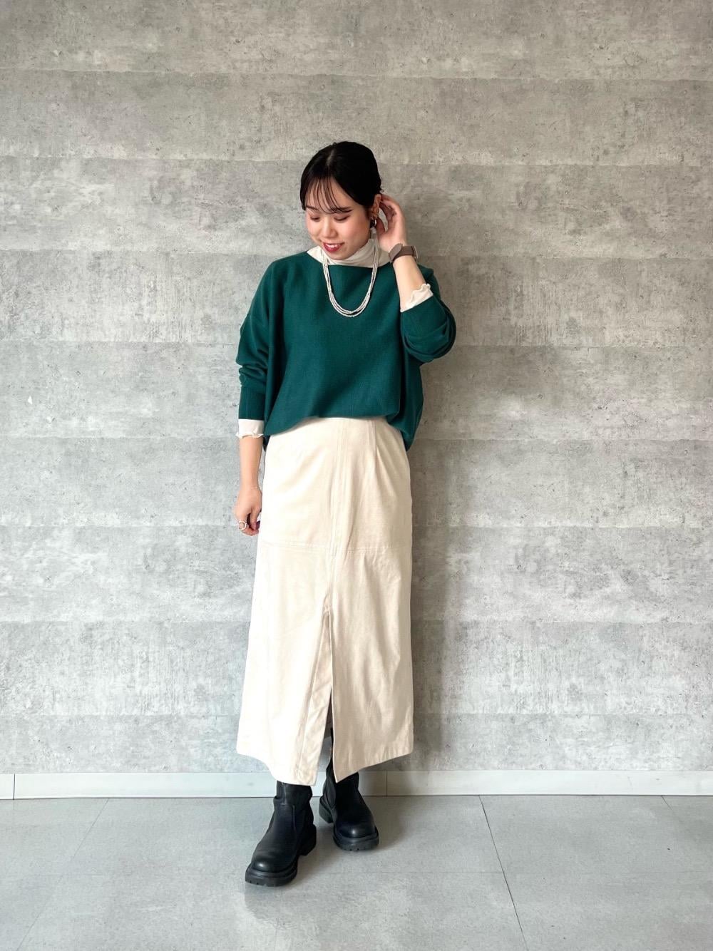 158cm/骨格ストレート/普段サイズM/着用サイズ トップス38ボトム38 【シアータートル】 サイズ感: 全体的にコンパクトめ。 素材感: 伸縮性のある柔らかい素材感。 着用感: 柔らかい肌触りで窮屈感もなく着心地◎ベストやニットなどにレイヤードするだけでオシャレ見えします。 【ミラノリブラメ入り裾ラウンドニット】 サイズ感 : ゆったりしたサイズ感。ヒップにかかる丈感。 素材感: なめらかな肌触りのニット素材。 着用感: 落ち感があり肩周りがスッキリ見えます。 ゆったりしていて楽な着心地。 【リバーフェイクスエードタイトスカート】 サイズ感 : ウエストはゆったりめ。足首が見える丈感。 素材感: 柔らかく暖かみのある素材感。 着用感: 体のラインが目立たない程度のタイトシルエットなのでボリュームのあるトップスともバランス良く合わせれます。