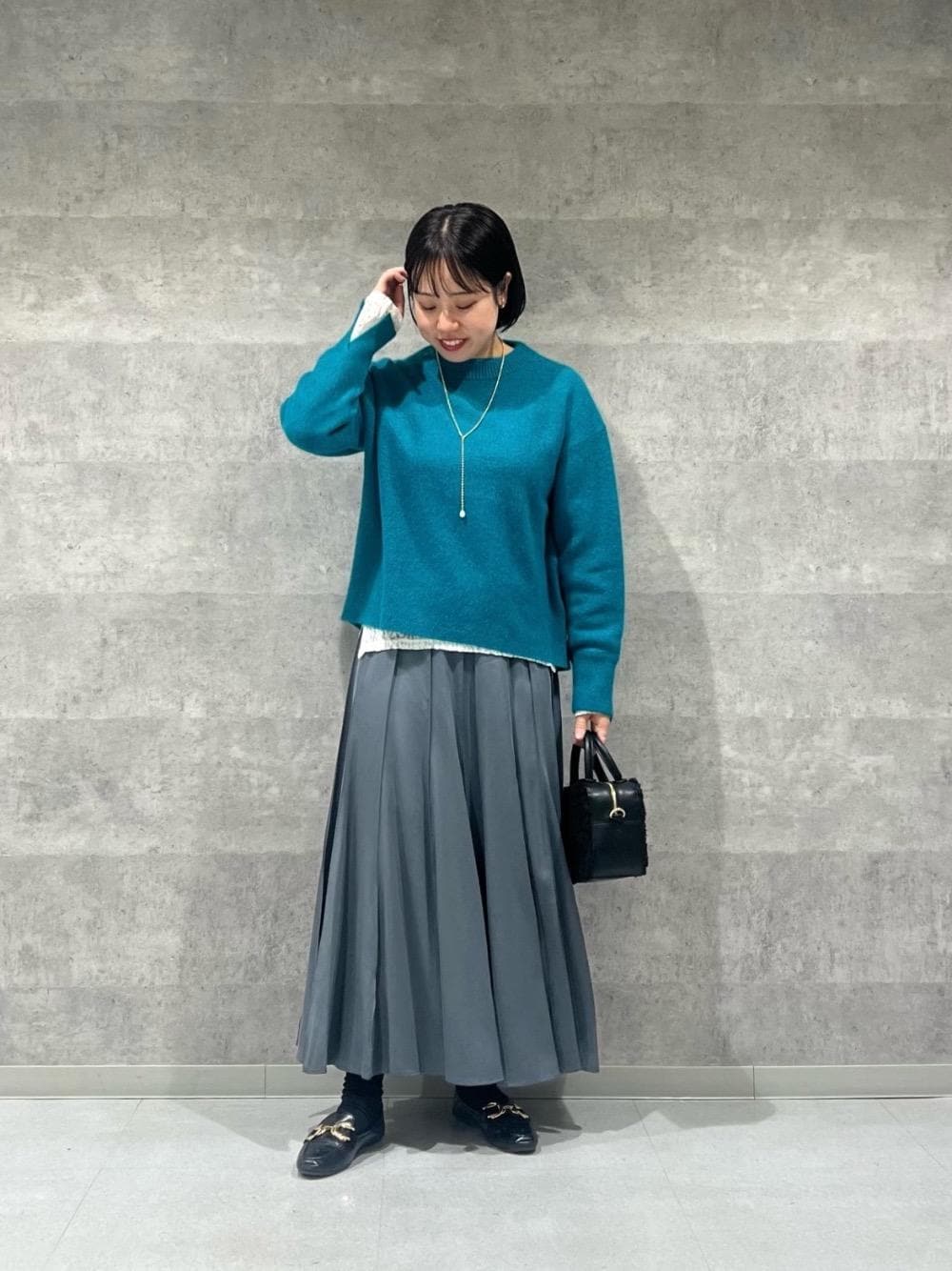 158cm/骨格ストレート/普段サイズM/着用サイズ トップス38ボトム38 【ストレッチレースクルーネックカットソー】 サイズ感 : コンパクトなサイズ感ですが伸縮性があり窮屈感は感じにくいです。 素材感: 繊細なレース素材。透け感があります。 着用感: レース素材が華やかで1枚でも、インナーとしても着映えます。 【モックネックチャイニーズラクーンプルオーバー】 サイズ感 : 全体的にゆったりしています。腰回りにかかる丈。 素材感: 柔らかく暖かみのある肌触り。 着用感: とても軽くて暖かいです。アウターも羽織りやすい程よい厚みです。 【フィブリルサテンパネルプリーツスカート】 サイズ感: ウエストは少しゆとりがあります。 素材感: なめらかでシワが気になりにくい素材感。 着用感: 揺れるときれいで程よく広がるAラインシルエットがとても女性らしいです。