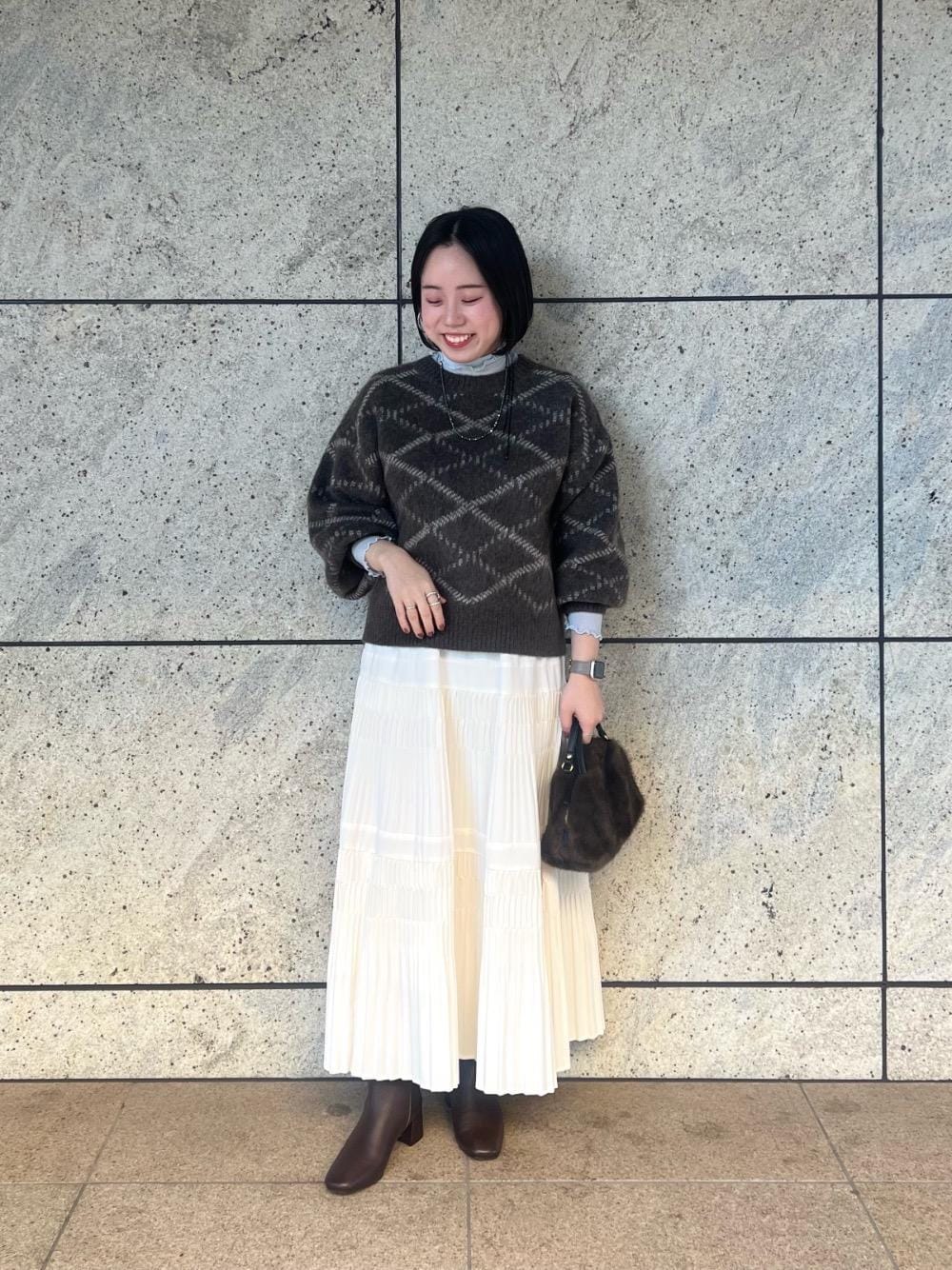 158cm/骨格ストレート/普段サイズM/着用サイズ トップス38ボトム38 【シアータートル】 サイズ感: 全体的にコンパクトめ。 素材感: 伸縮性のある柔らかい素材感。 着用感: 柔らかい肌触りで窮屈感もなく着心地◎ベストやニットなどにレイヤードするだけでオシャレ見えします。 【起毛チェックニットプルオーバー】 サイズ感 : 身幅、袖はゆったりしています。程よい丈感でインしなくてもバランスとりやすいです。 素材感: ふわっとしたニット素材。柔らかい肌触り。 着用感: ボリューム袖とコンパクトな丈感のバランスが可愛いです。シャツやブラウスなどともレイヤードしやすいデザインです。 【デシン変形プリーツスカート】 サイズ感 : ウエストはゴムで丁度いいサイズ感。足首が覗くぐらいの丈感です。 素材感: 程よくハリがあり、シワが気になりにくい。 着用感: 細かい変形プリーツで程よく広がるシルエットが女性らしいです。ニットなどと合わせても軽さがでてバランス良く合わせていただけます。