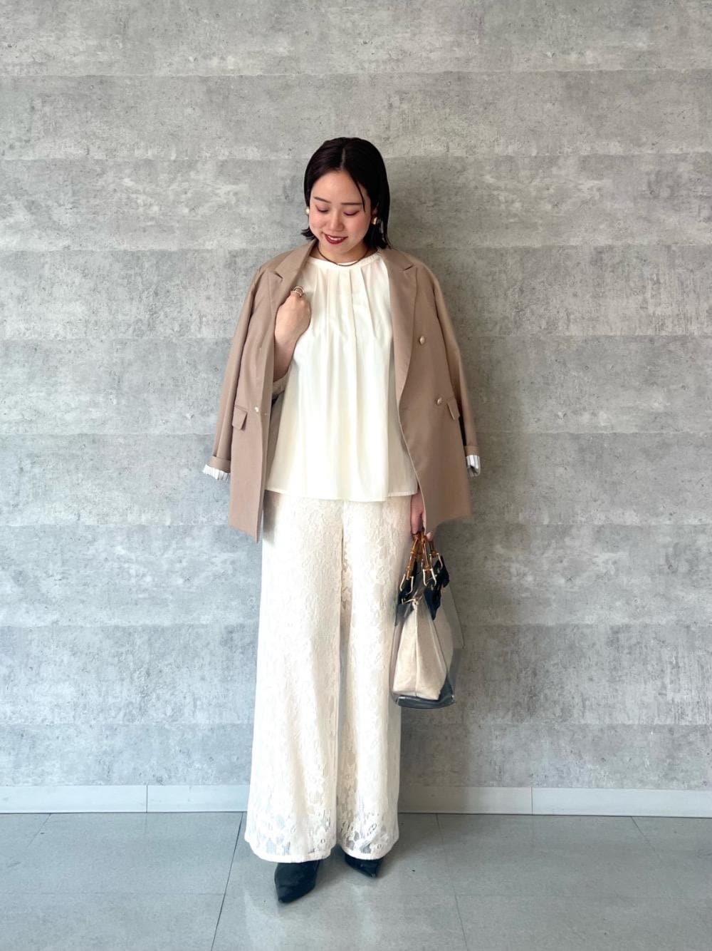 158cm/骨格ストレート/普段サイズM/着用サイズ トップス38ボトム38 【タックスリーブブラウス】 サイズ感 : 体のラインが気にならない程度のゆとりがあります。 素材感: 薄手でなめらかな素材感。 着用感: 袖のタックデザインが着映えて大人可愛いデザインです。肌触りも良く着心地◎ 【ダブルブレストジャケット】 サイズ感 : 38サイズで丁度いいサイズ感。腰回りも隠れるぐらいの丈感です。 素材感: ややハリのある素材感。 着用感: ゴールドボタンが上品なアクセントになります。軽く柔らかい着心地です 【フラワーメッシュレースワイドパンツ】 サイズ感 : 少しゆとりがあります。丈は丁度いいです。 素材感 : 柔らかいレース素材。 着用感 : とても楽な履き心地です。スッキリしたワイドシルエットなのできれいめにも◎