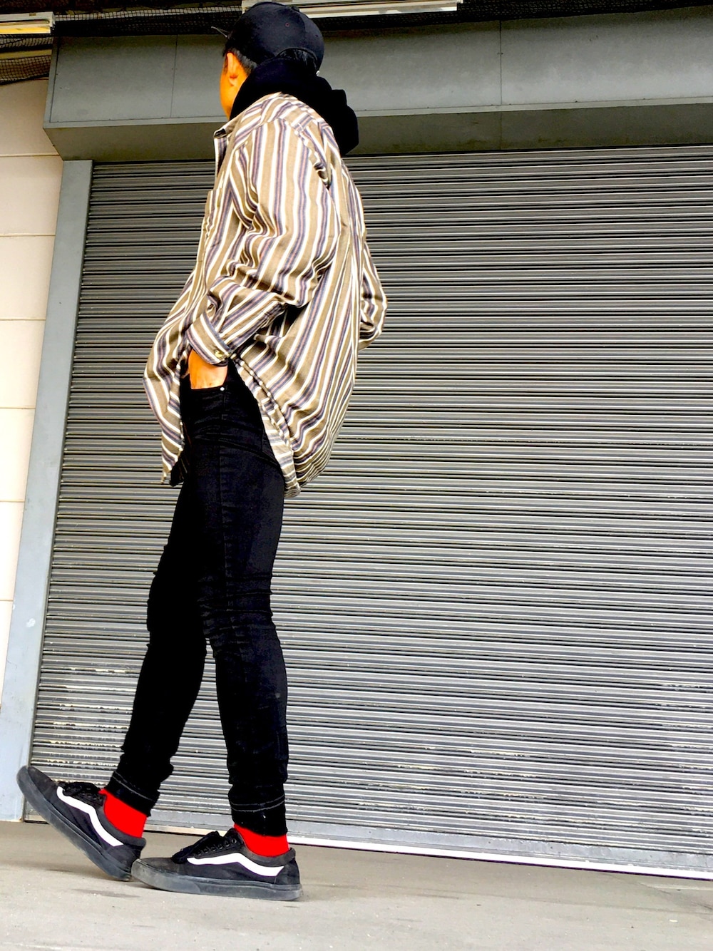 古着屋で購入した超オーバーサイズのシャツを、アウターぽく着ちゃいました! このシャツは、アメリカのスニーカーで有名なプロケッズのシャツです! オーバーなサイズ感と渋い色味が合わせやすくて即買いしました! 古着屋でしたが、タグとかも残ってて、新品未使用! いい買い物しました! え?! 何円やったか?て?! それは250円でしたよ! ええ!マジです! 値段見た時は、それはそれは チョットナニユッテルカワカリマセンでした!