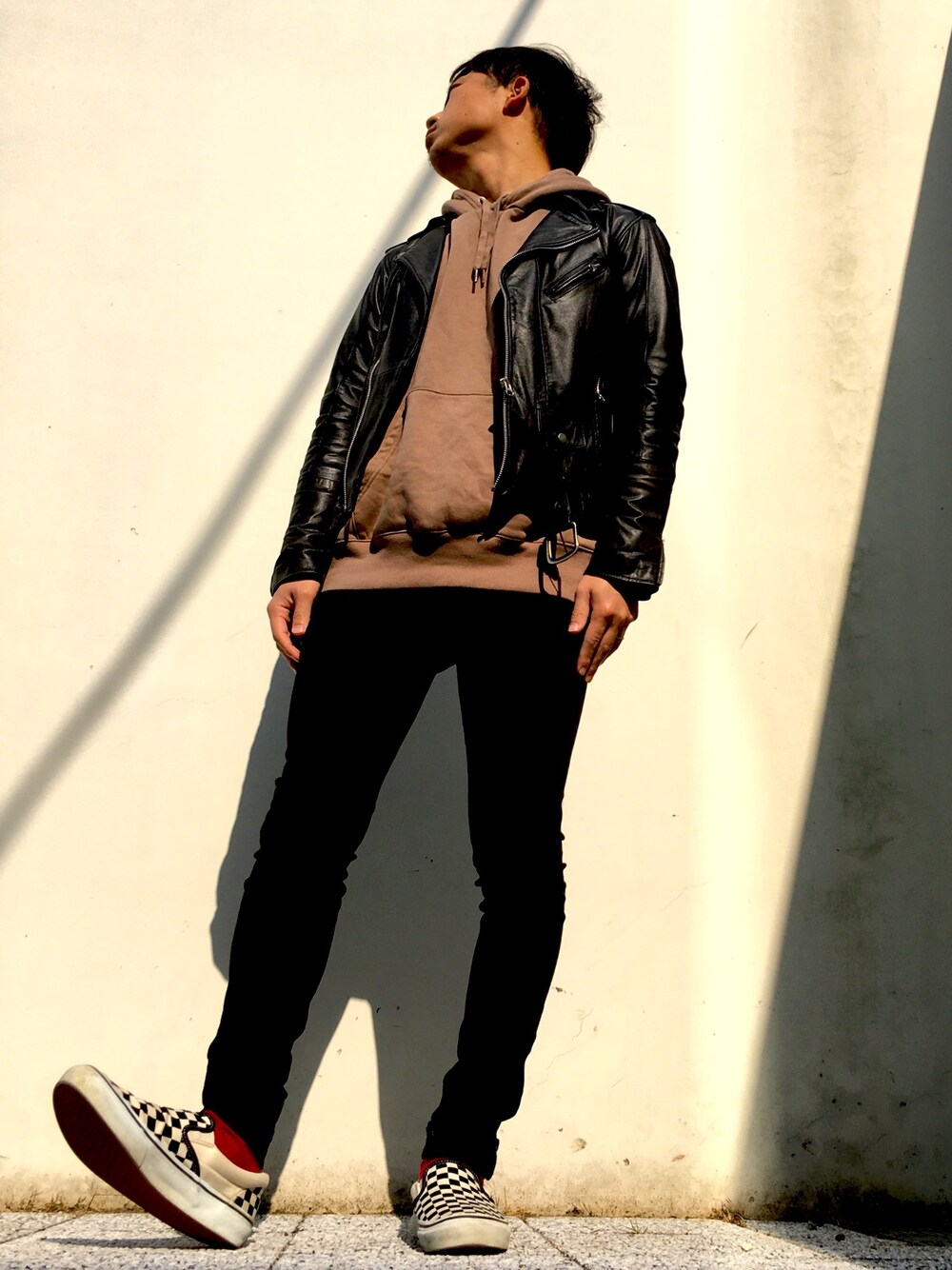 レザージャケットと、 黒スキニーで、 ハードな感じになりそうなところを ミルクチョコレート色のパーカーでソフトにしました!