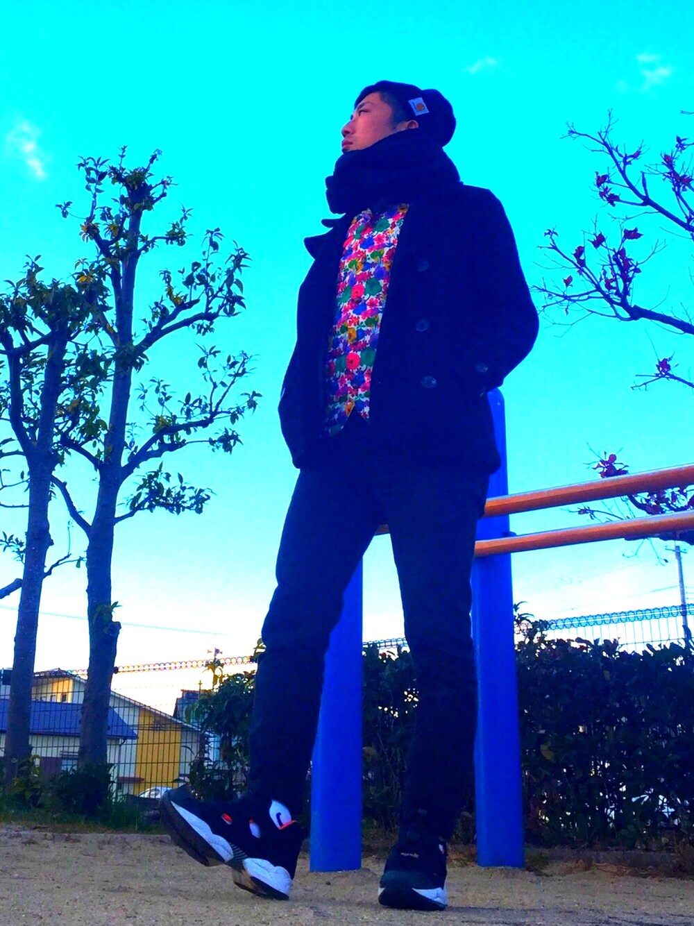 さっむいですねー! これ雪積もるんちゃうかくらいですねー。 てことで、完全防寒です。 高校の時に買った古着のピーコートの中にパーカーと総柄のインナーダウン挟みました。 靴下とダウンベスト以外真っ黒。 10年以上前に買ったもんでもこんな感じで活躍するもんですねー。 え?!歳がバレる?! スイマセン。 チョットナニユッテルカワカリマセン。 え?!何歳までそんな柄物着るんか? て?! スイマセン。 チョットナニユッテルカワカリマセン。