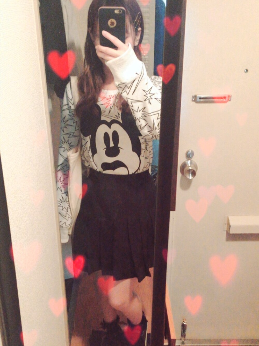 昨日の入荷で入ってきた ミッキー🐭( 笑 ) 出勤服だけに着ると決めて 買っちゃった( 笑 ) 絶対すぐ着なくなるやつ( 笑 ) 久しぶりにスカート履いた◎* 今日はディズニーに行くJKって感じ( 笑 )