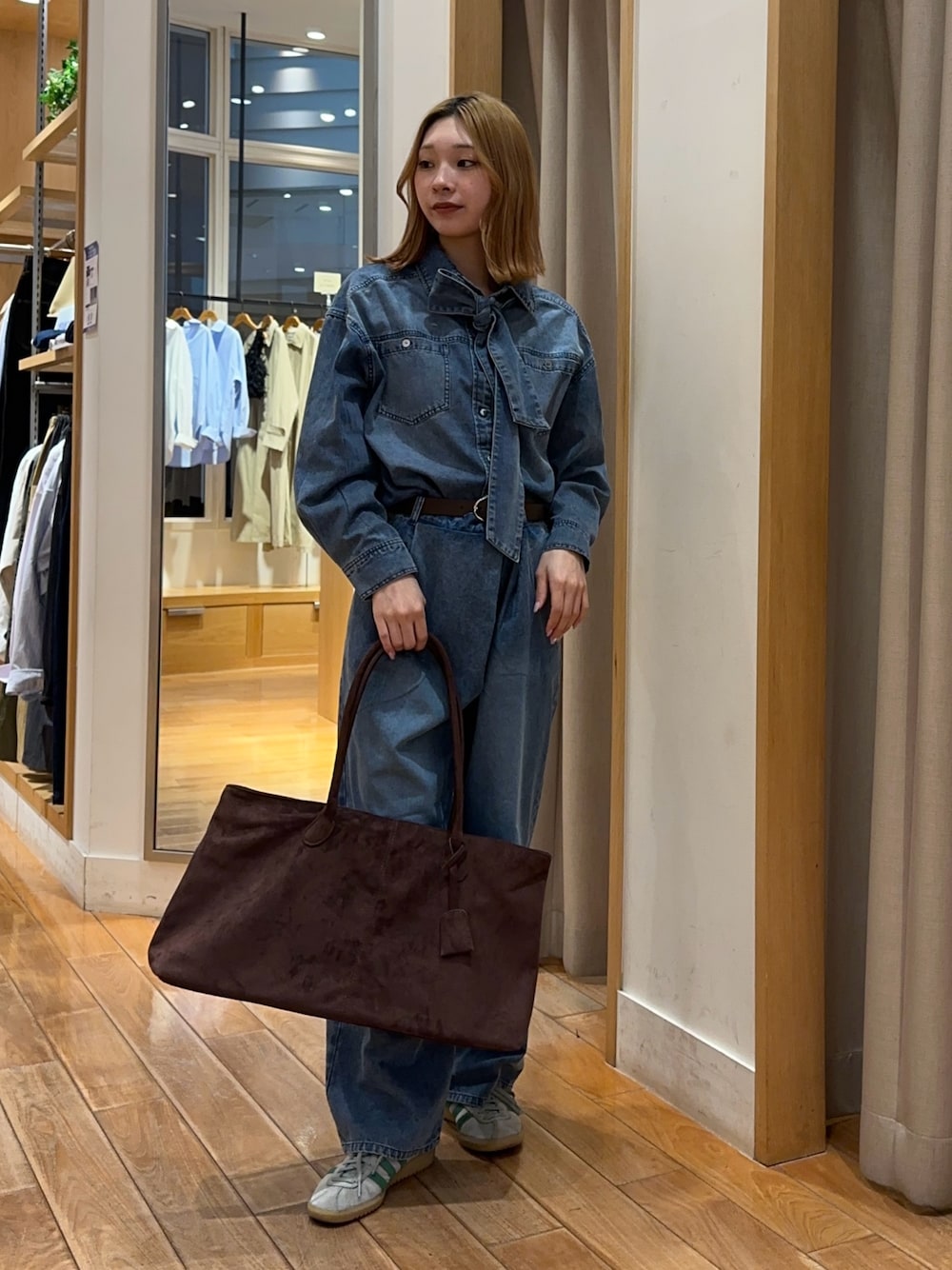 ◎トップス 38/ワンサイズ ●取り外しできるボウタイ付きのデニムシャツです! 着丈スッキリめで出したままでもダボッとしすぎずに着ていただけます! 前開きなので、1枚着でも織としてでも使っていただけます! ◎ボトムス 36、38の2サイズ展開 163センチで38サイズ着用 ●トップスとセットアップで着れるアイテムです! ラップデニムで、前のデザインが可愛く、ベーシックなデニムに飽きてきた方におすすめです! デニムですが、薄手で柔らかい素材なのではるなつにピッタリの履き心地です。 ◎バッグ ●大容量なフェイクスエードのトートバッグです! 持ち手が長めで肩がけもしやすい長さになっています! バッグの口はマグネットが付いており、内側に金具付きの紐があり付けていただくと、より中身が見える心配もなくなります! 内側がボーダー柄になっていて可愛らしいデザインです!