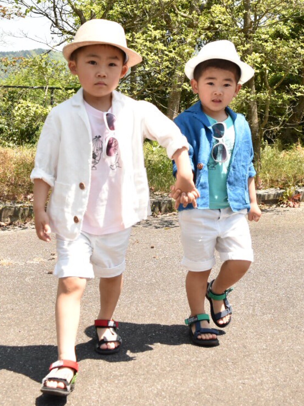 夏男🍉 先日キッズファッションショーに参加させてもらった時の衣装を着ています🌈 がちごちのランウェイには可愛くて笑いました🎈