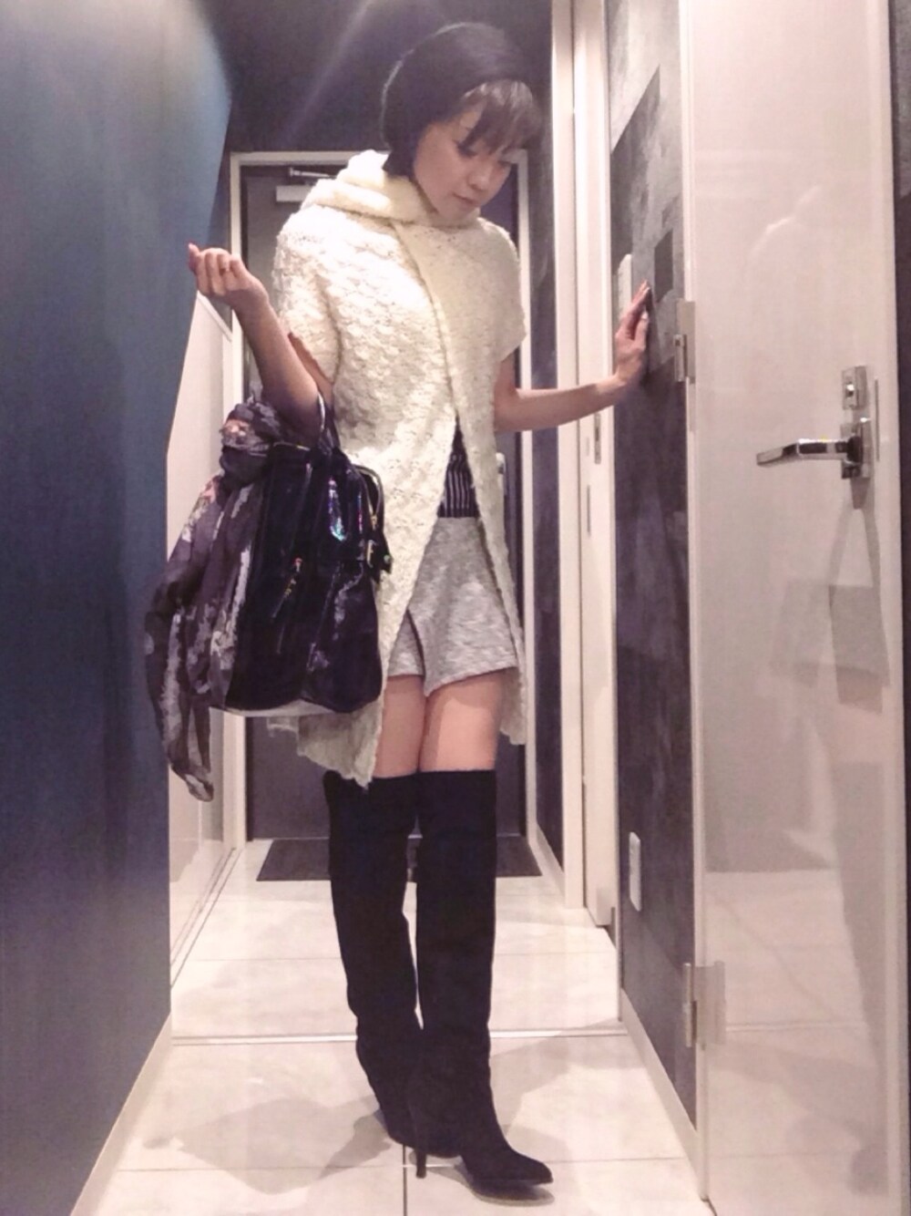 ☆☆☆ガウン×キュロットミニ☆☆☆ 白。 ざっくり。 長め丈。 フードがラビットファー仕立て。 お気に入りガウン( ´ ▽ ` )ノ ボタン閉めると首がきゅっとなるけど… GU¥390ありがとうのキュロットミニを合わせて、初冬のコーデ。 今日はいかもたこも出ませんwww