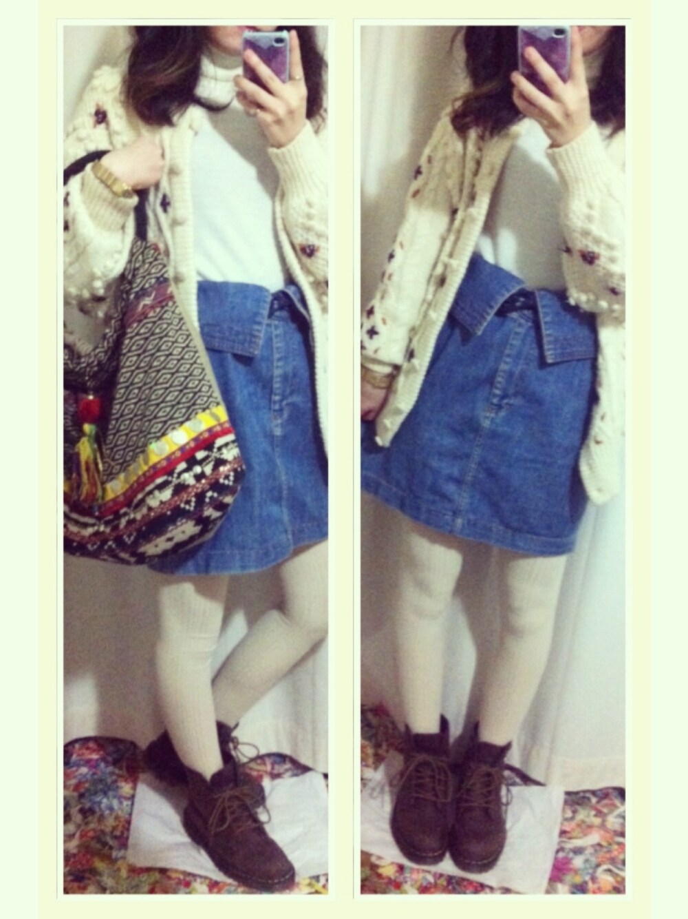 お気に入りのニット。 20年前の母の手作りを譲り受けたもの、、 ニット タートルネック / 無印良品 スカート / 古着 ブーツ / Dr. Martens バック / mystic