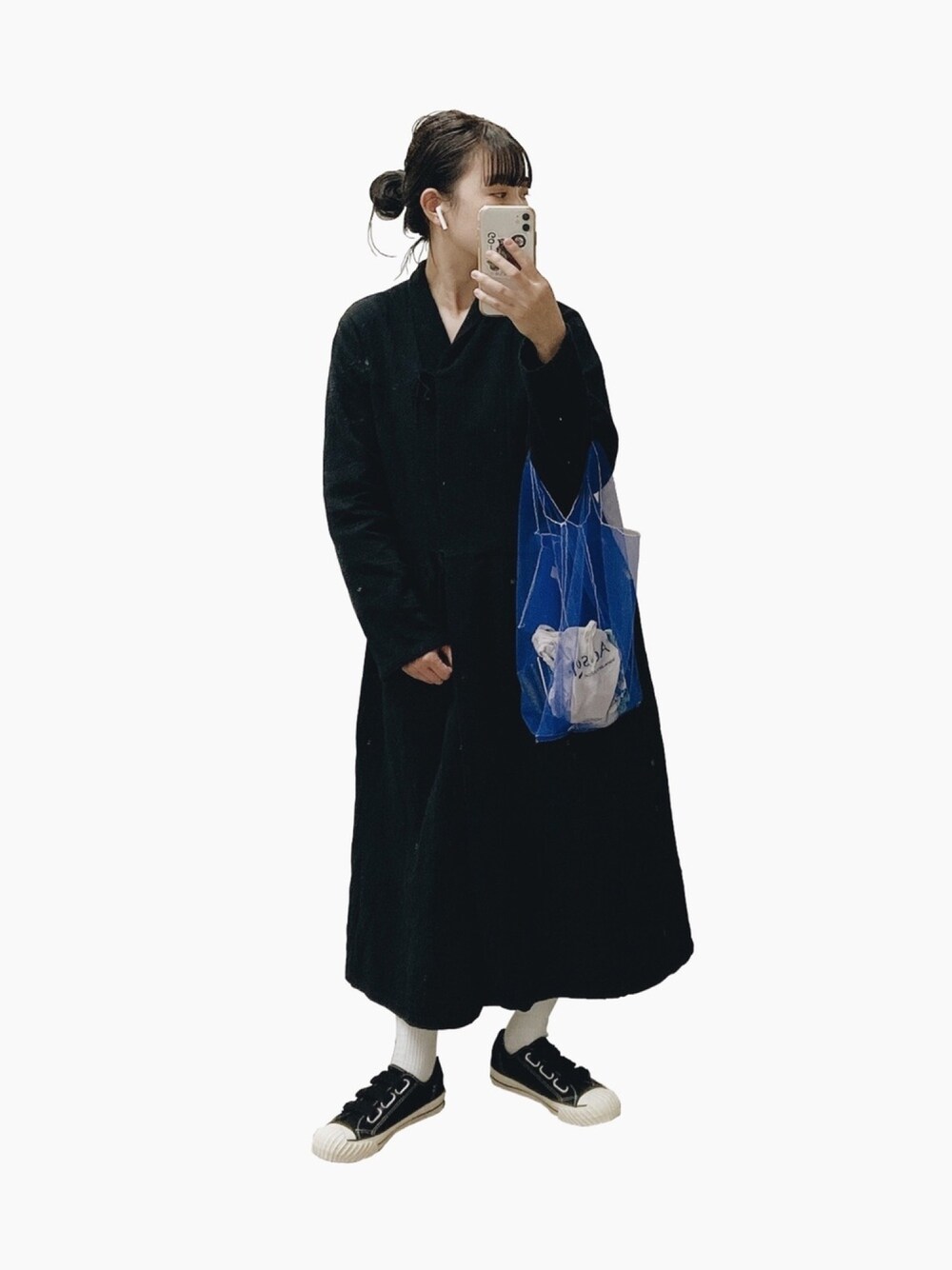 黒コーデに青のバッグ