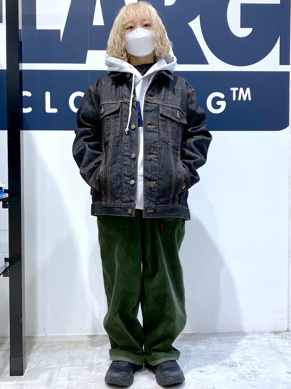 シブメのデニムジャケット。アッシュカラーのパーカーと合わせて、シブくなりすぎない感じに。冬らしくコーデュロイパンツとコーデ。
