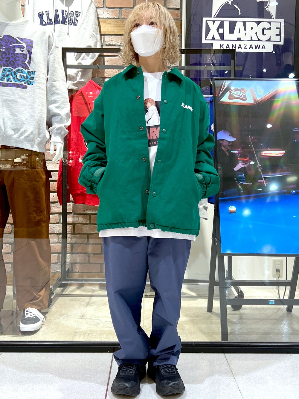 春っぽいカラーコーデ。明るめのグリーンカラーが引き立つように、インナーはシンプルに。パンツも主張が強くならないように少し淡めのブルーをチョイス。