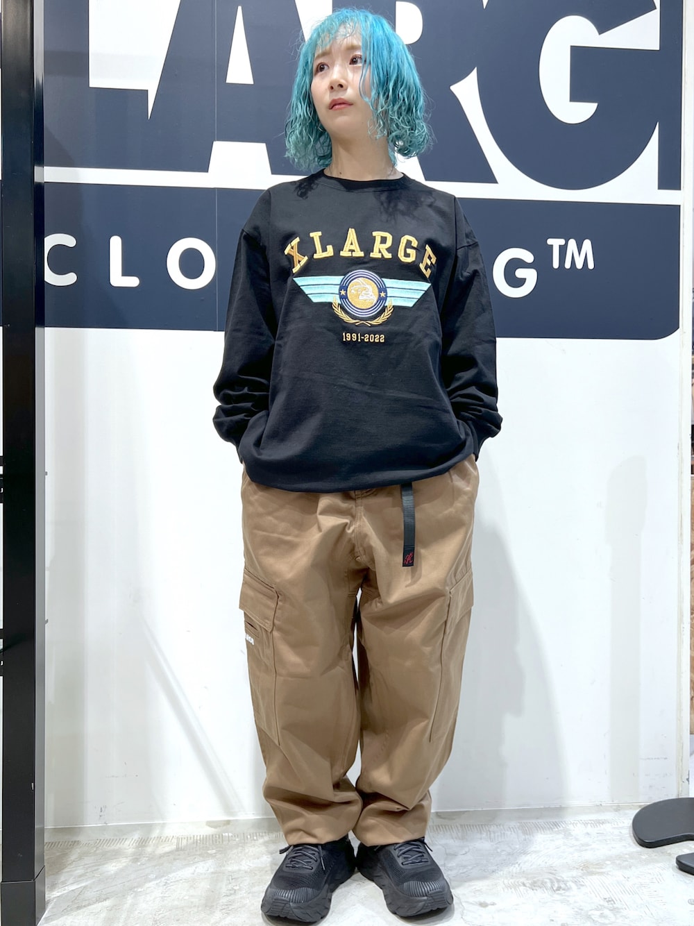 大きく刺繍されてるデザインのロンTは1枚で着るのもオススメ。刺繍は光沢感出るのでかっこよさマシマシ。パンツはかっこよくカーゴをチョイス◎