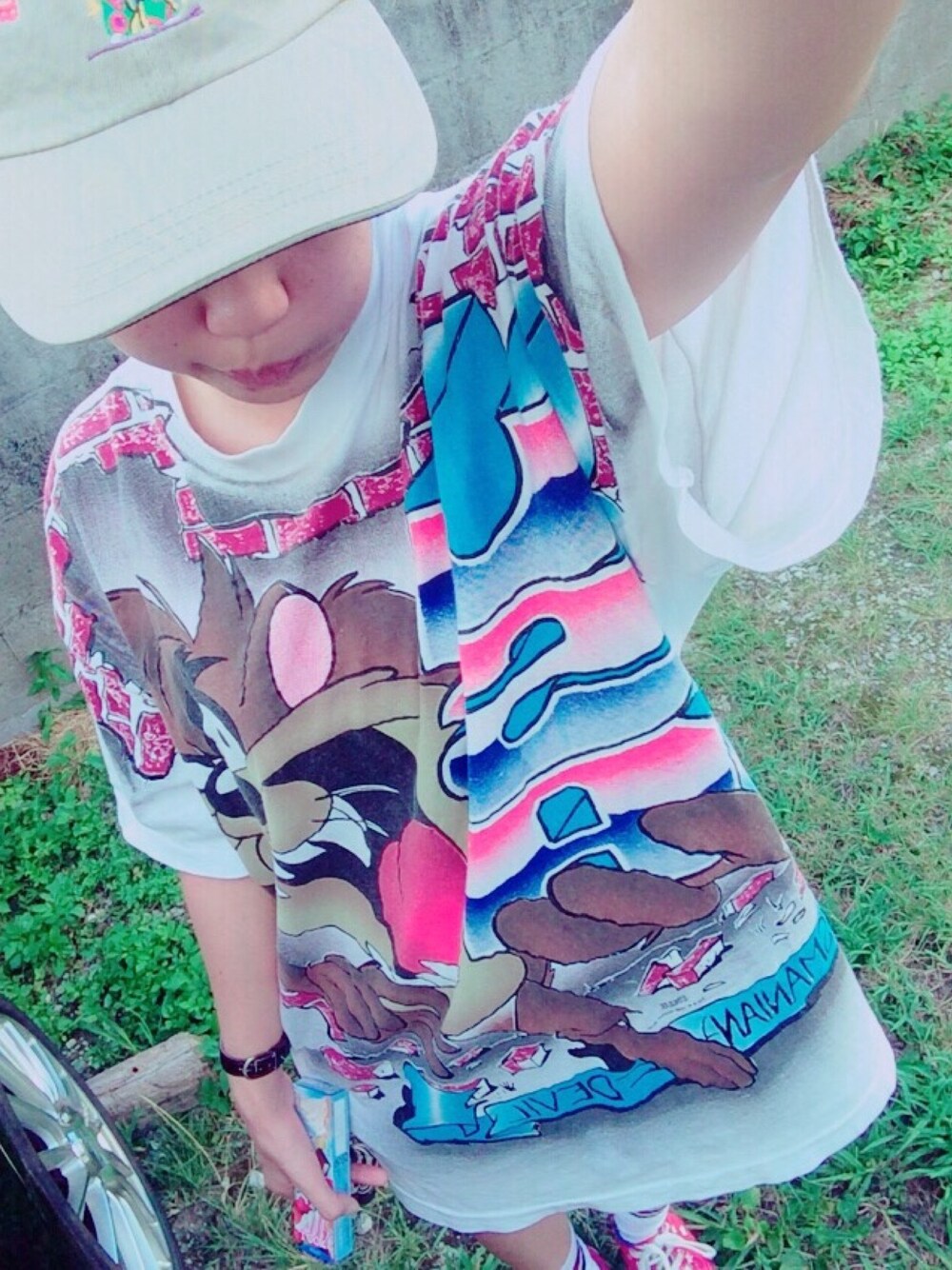 ホワイト系のTシャツ/カットソー、ベージュ系のキャップを着用したレディースの夏コーディネートの1枚目の写真