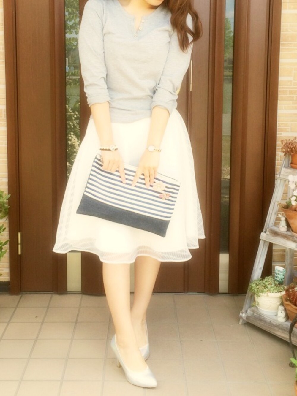 前回とアイテムはほぼかわっておりません(笑) ラインが綺麗すぎるミディ丈に、ハイウエストではなくあえてトップスをダウン。(トップスは5年前くらいのモノを引っ張り出して来ました。笑)シューズはシルバーで今年っぽく。大人なリラックスカジュアルに。 どこかにボーダーがないとソワソワするので、今日もヘビロテなクラッチを☆