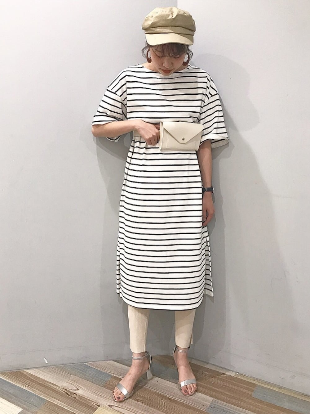 シンプルなボーダーワンピを柔らかいベージュトーンのアイテムでワントーンコーデに仕上げました✨ 今年おしゃれ格上げアイテムとして注目のウエストバッグをワンポイントに💕