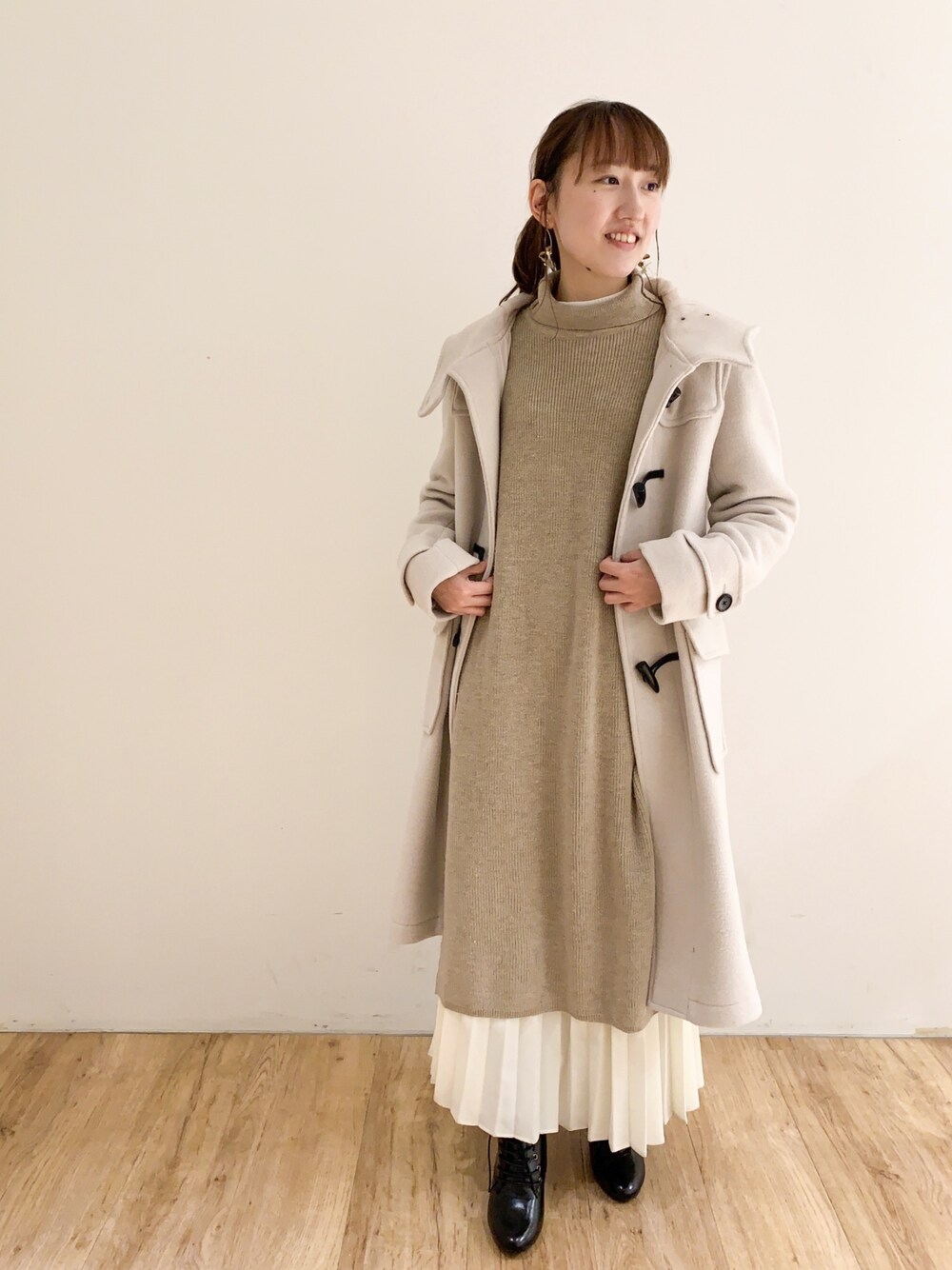 今年のダッフルコートは ライトカラーがおススメです✨ 中をワンピースで合わせて ラクチンオシャレを目指してみました☺️