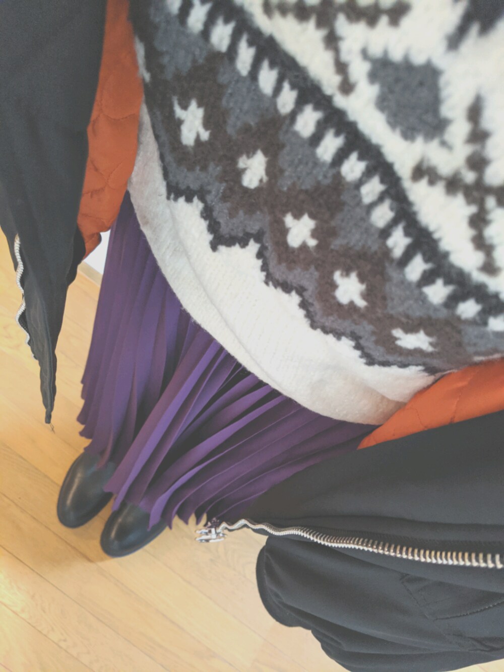 2020.01 お気に入りのパープルスカート。 秋から着てるけど、このニットと合わせると一気に冬っぽくなるな〜! そろそろ、春らしい色味着たーいなぁ