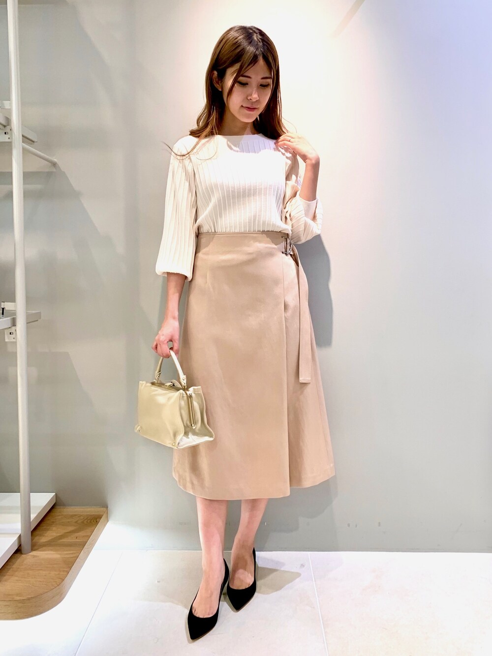 柔らかいベージュのワントーンコーデ。 ニットはリブになっていますが、 体にピタッとせずに着ていただけます! スカートは巻きスカート風で、 いつものタイトにあきた方へおすすめです。