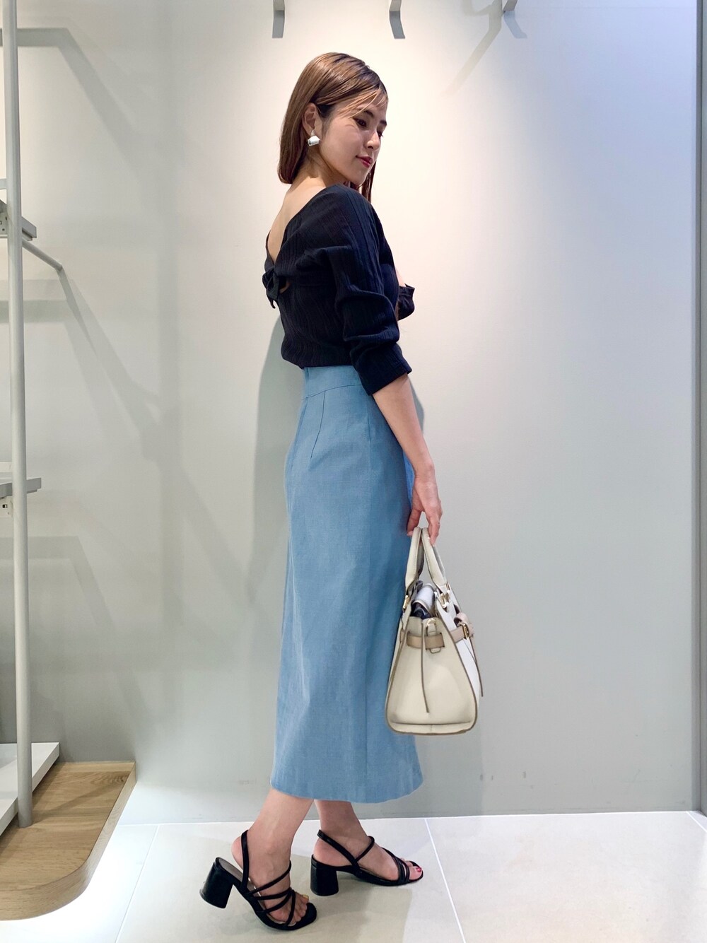 バックスタイルが可愛いカットソー◉◉ 甘めなカットソーは タイトスカートで大人っぽくあわせると ほどよくフェミニンな印象に☺︎♡ こちらのスカートは 縦横に伸びるストレッチで履き心地が抜群にいいです✨