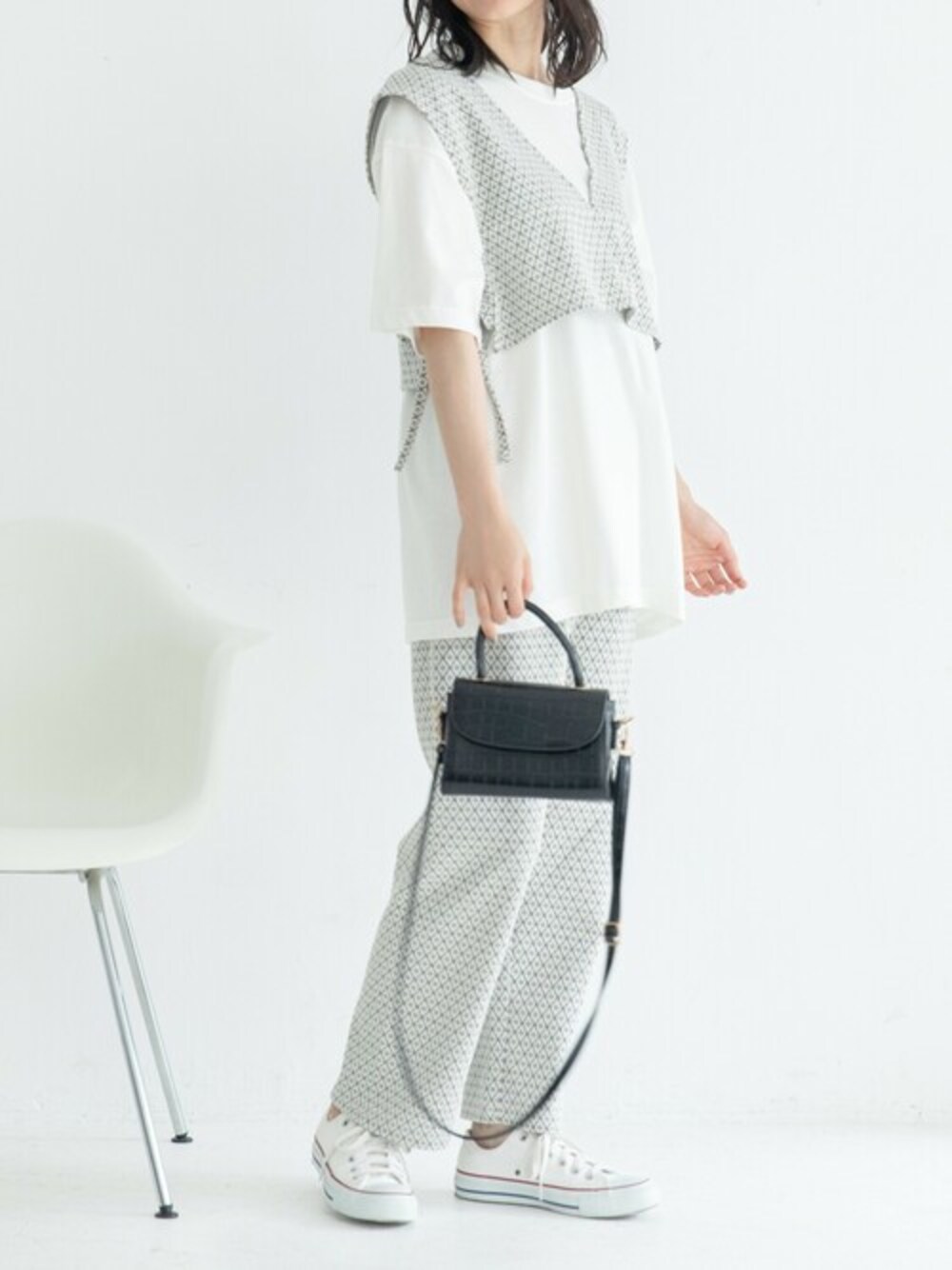 いいねやフォルダインありがとうございます♪ 参考になったらうれしいです♪ ・・・・・・・・・・・・・・・・・・・・・・・ ジャガードビスチェとジャガードパンツの セットアップコーデ! トップスは白Tとビスチェのセットアイテムなので レイヤードも簡単です◎