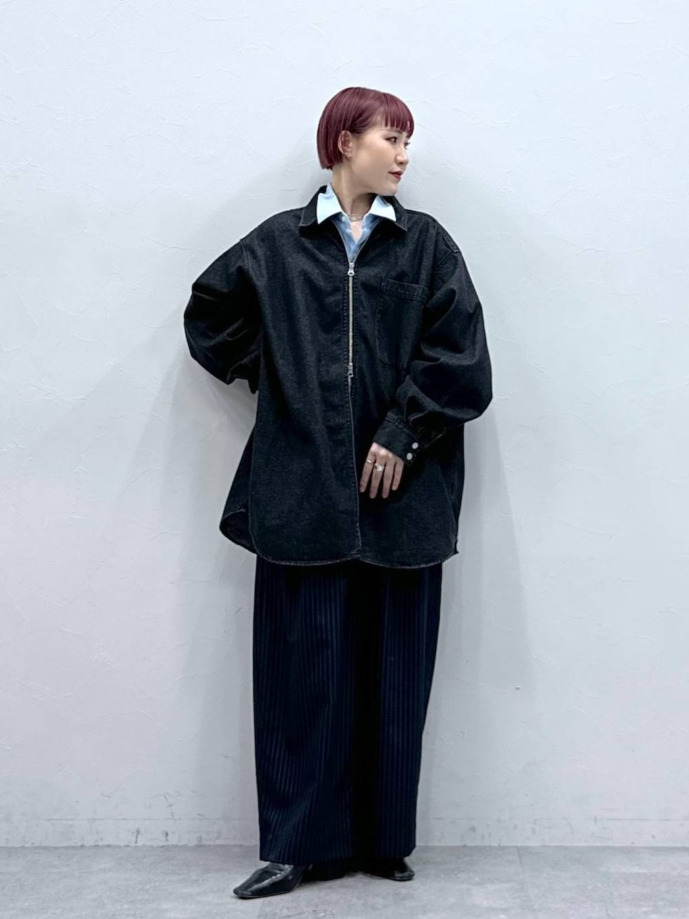 たけお(RAGEBLUE 本部)のシャツ/ブラウス「【UNISEX】 overdyed denim loose shirt/選べる着丈/Wジップオーバーダイ加工デニムルーズシャツ」を使ったコーディネート