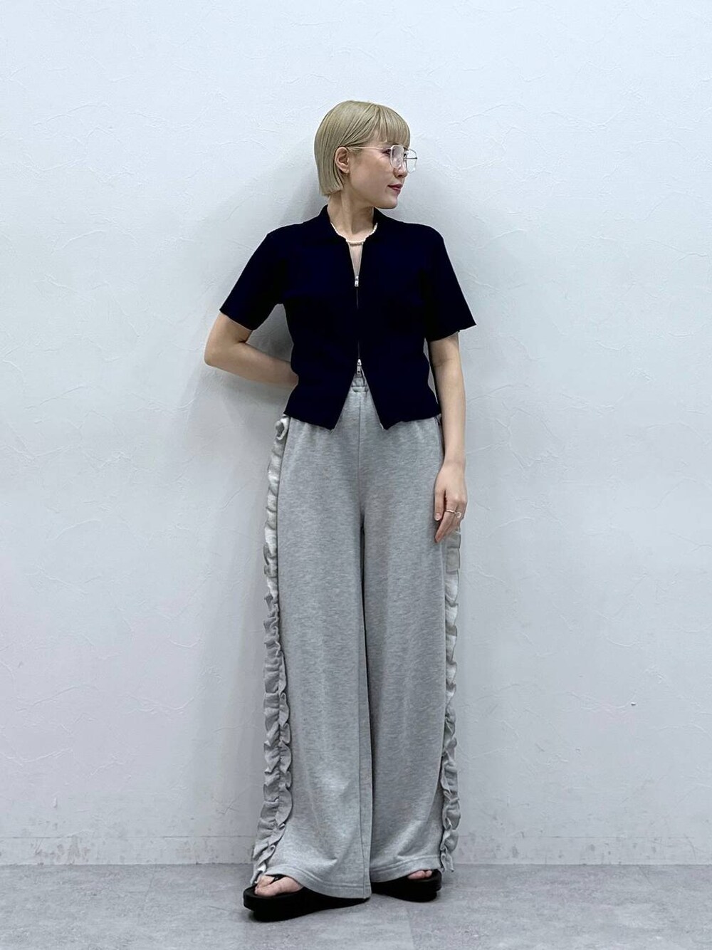 たけお(RAGEBLUE 本部)のスウェットパンツ「サイドフリル/ラメスウェットワイドパンツ」を使ったコーディネート
