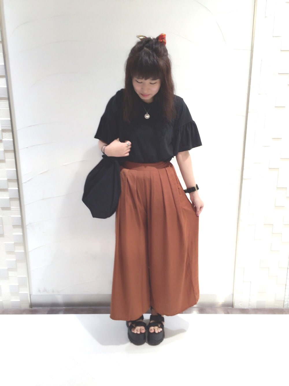 いつもいいねありがとうございます! 今日の出勤コーデです💗💗 マイブームのオレンジはブラックと合わせて大人っぽく着る派です🤘🏻 よく履いてるk3のサンダルはかなり厚底なのに歩きやすくて疲れないです!オススメです😍