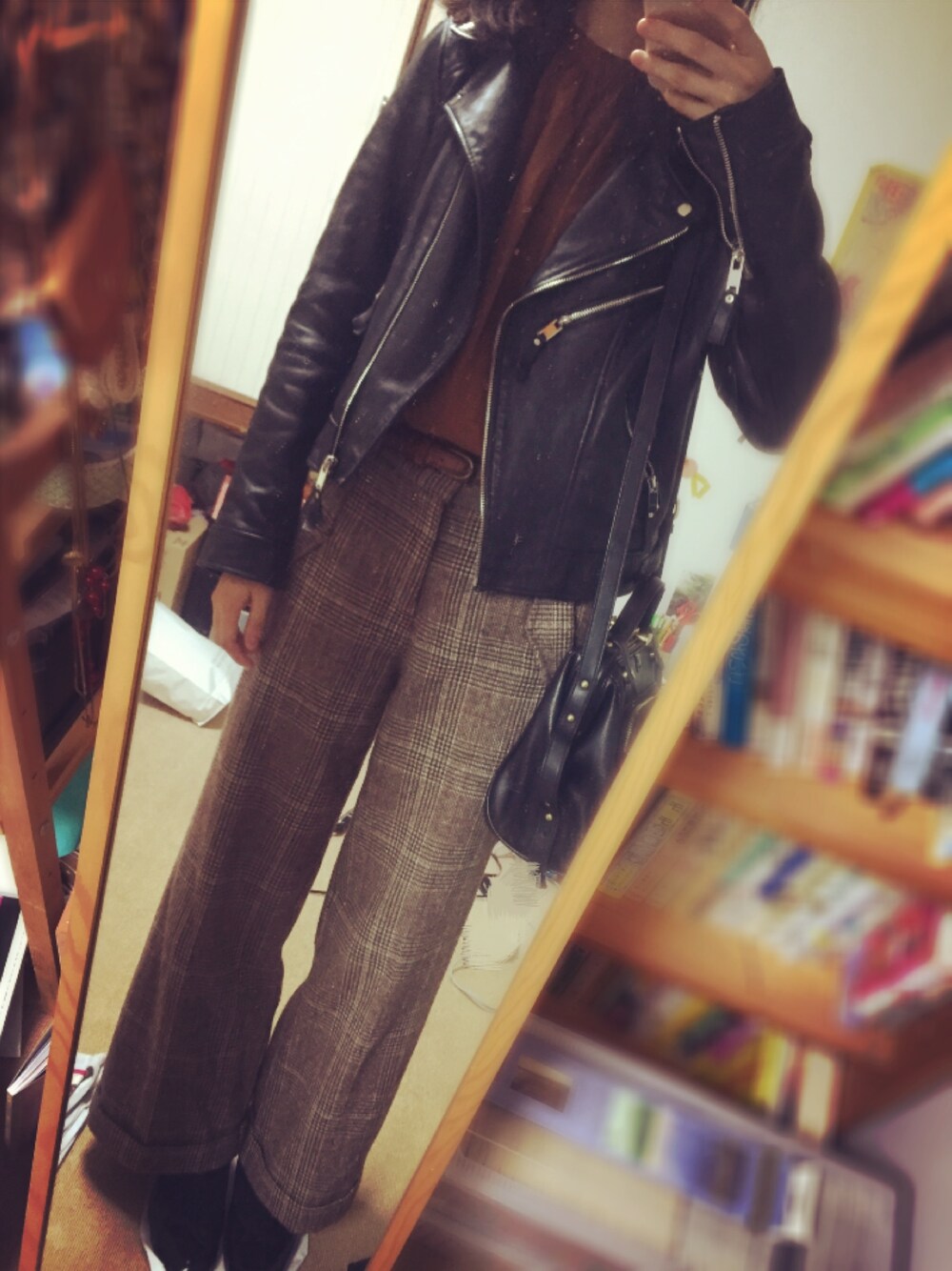 茶色×黒 ポイントカラーに赤を足そうと思ったけど思ってた感じと違ったので無難にこの2色になりました。 靴は見えづらいですがバレエシューズです