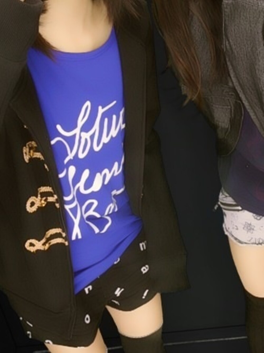 みゅ~ぽんのTシャツ/カットソー「ナポレオンパーカー BlueのTシャツ 英字柄のショーパン ニーハイソックス 黒のインヒールスニーカー」を使ったコーディネート