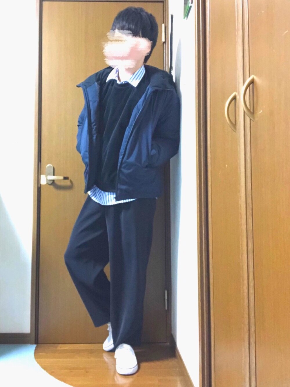 ネイビーのダウンとストライプシャツの青が相性いいんじゃないかなーって思います☺️ なかなかバランス取れてていいんじゃないかなーっと。