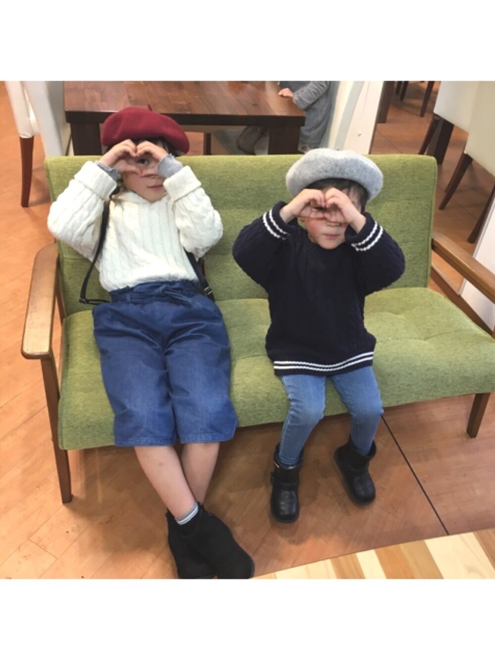 GUのケーブルニットでおそろコーデ♡ 娘はニットの中に襟と袖がフリルっぽくなってるカットソーを重ねてます♡ ライン入り靴下のチラ見せで、弟との統一感をだしてみました♪♪