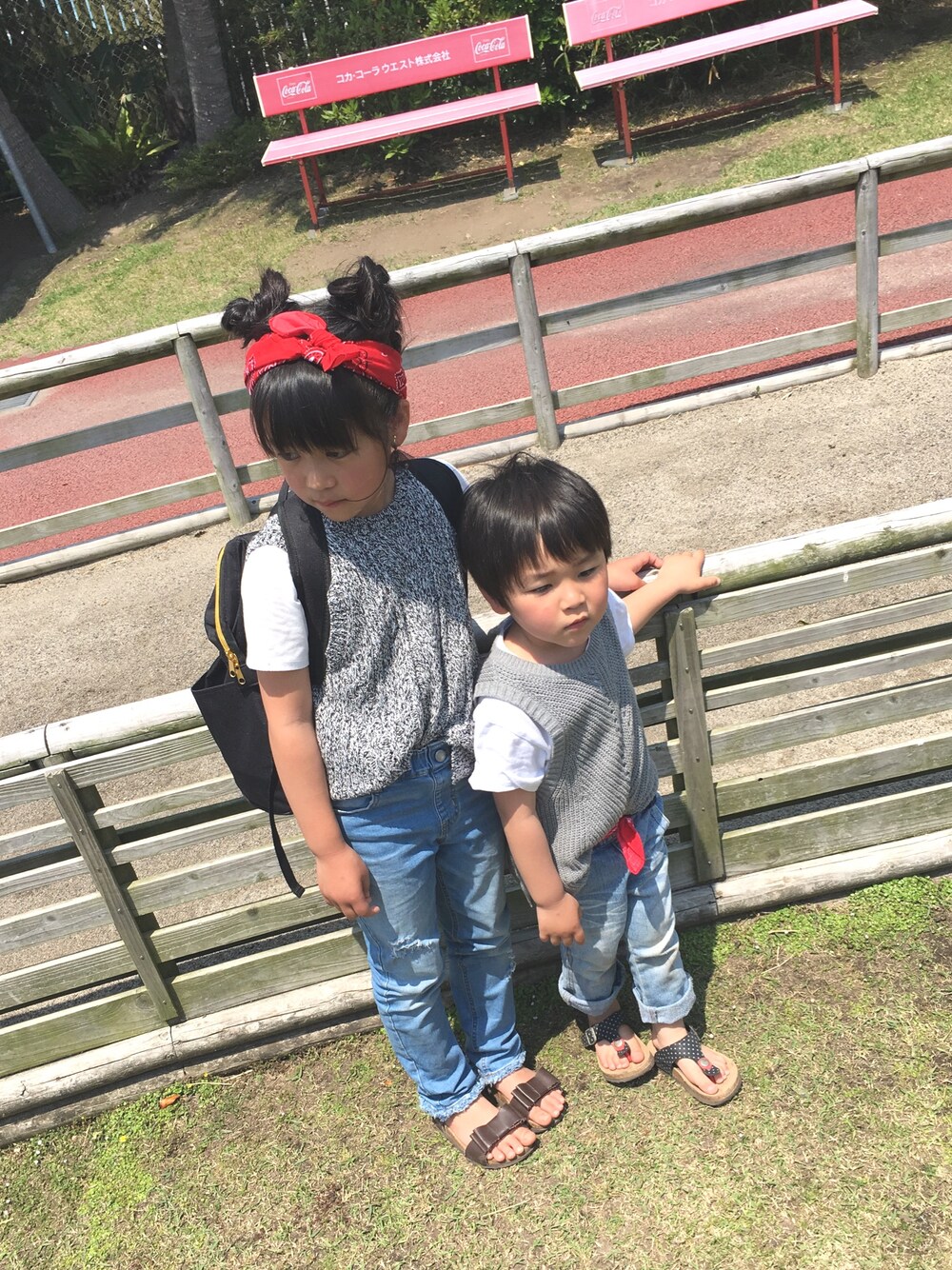ベストにデニムのシンプルコーデです♡ 差し色にバンダナを使い、姉はカチューシャに弟はベルトとして使いました☆