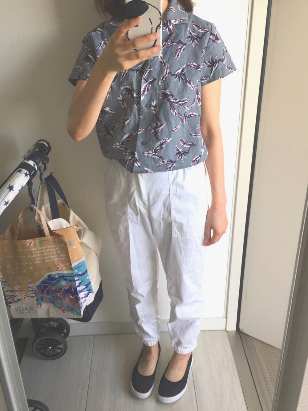 トップスは夏セールで3000円くらい ボトムスはユニクロのワゴンセール品で1980円 スリッポンは母からの誕プレ(^^)