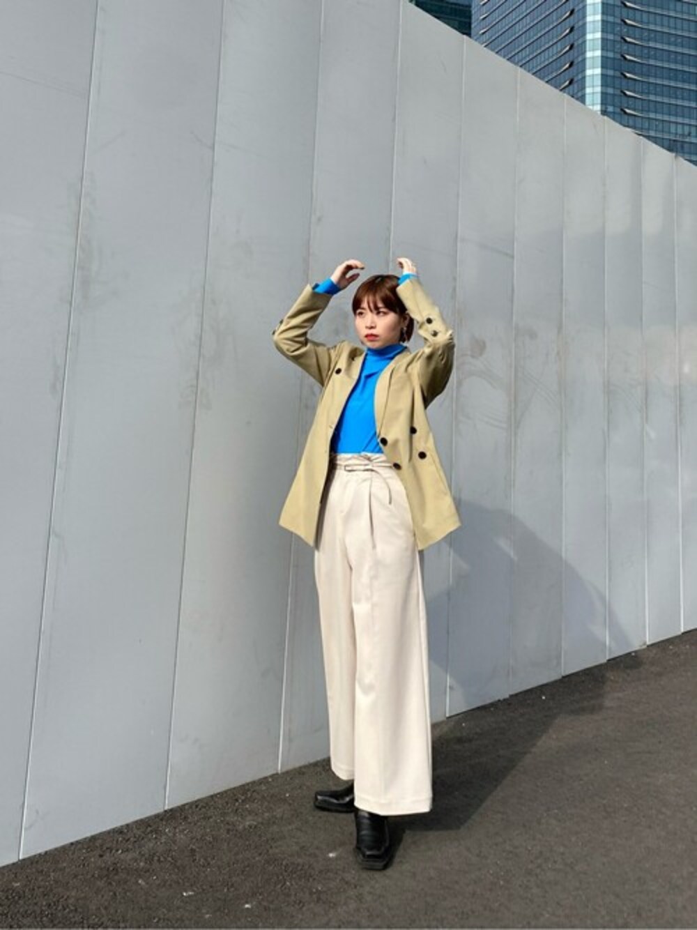 コレクションのジャケット 鮮やかなカラーのカットソーと合わせるのが 私のオススメです。 このお馴染みパンツ、 ワンタックワイドパンツは1枚持っててくださいませ!