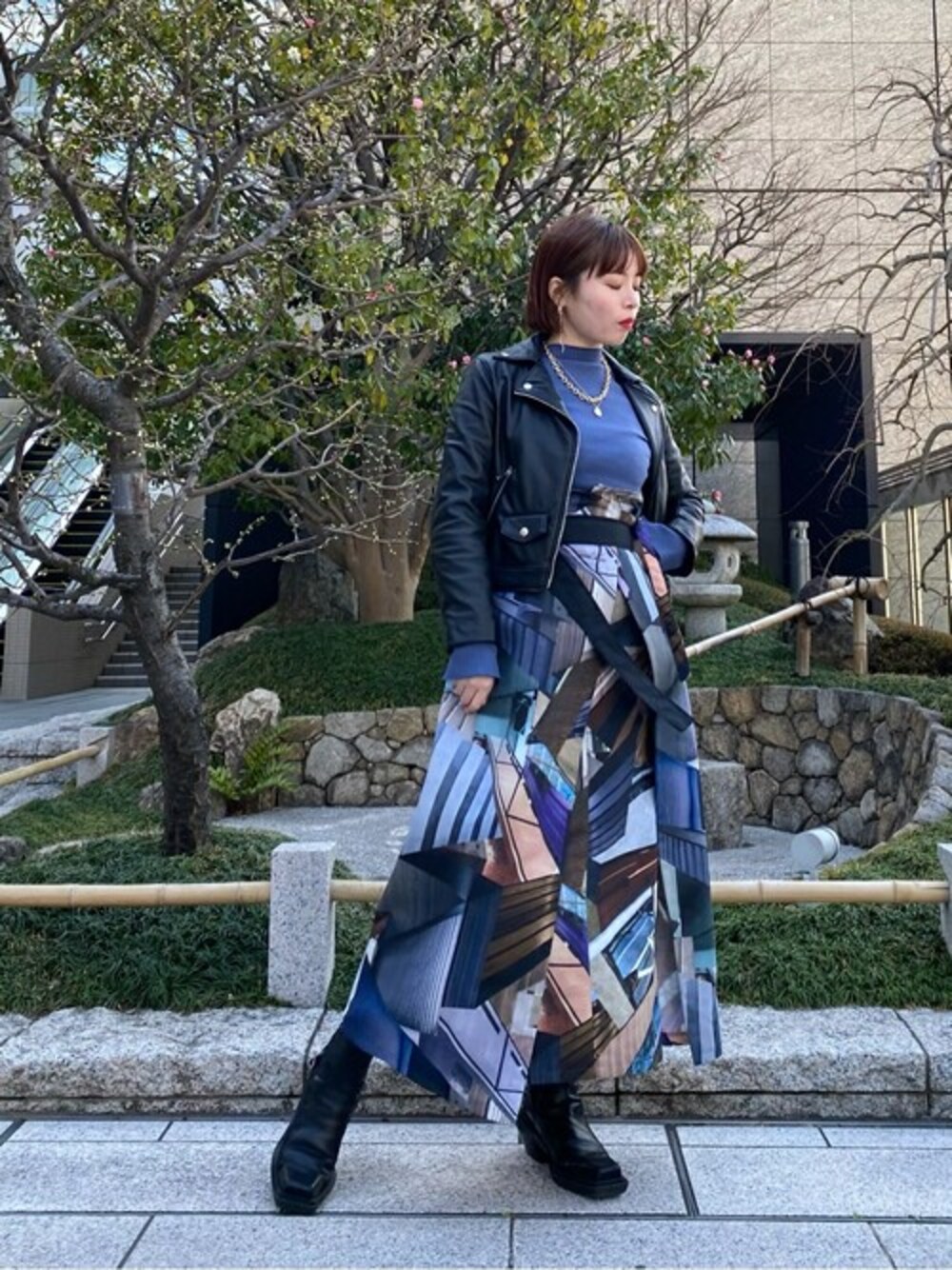 新作No. 1オススメコーデです! もう可愛いすぎませんか、 このプリント柄スカート、主役級です! ライダース合わせでかっこよく