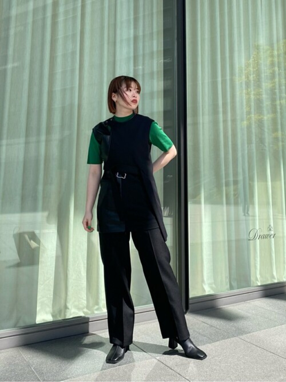 この春はグリーンな気分です このベストは主役級、一枚切るだけでお洒落完成 インナー次第でどの季節も行けちゃいます