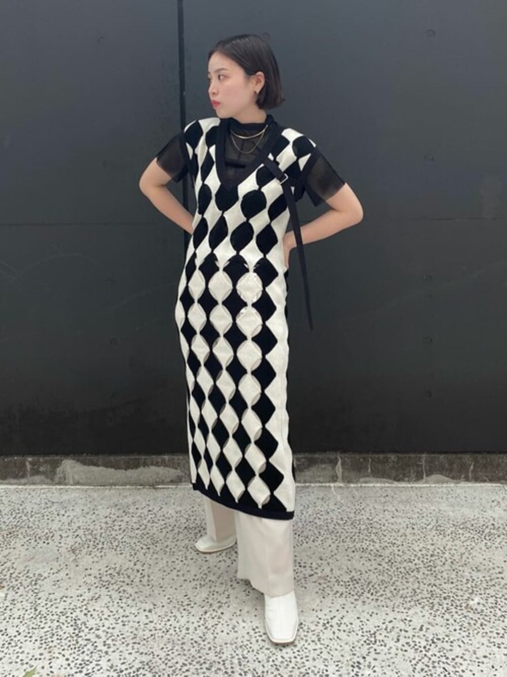 可愛すぎるパターンが目を引くニットワンピース。レイヤードするの楽しすぎます。UNITED TOKYOのバッグとも相性◎