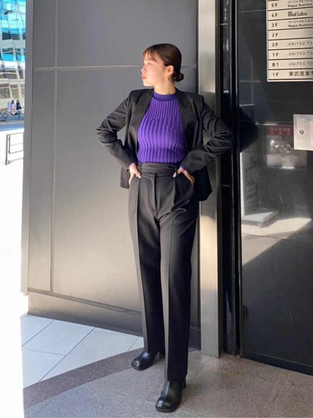 ぱきっとしたパープルが映えるコーデ ジャケットもパンツもベーシックだけどシルエットが綺麗で使いやすい!