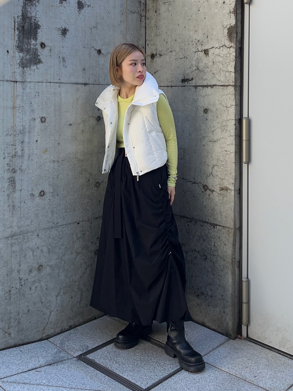 大人気のバルーンスカートを使ったスポーティなコーディネートもおすすめです。 ダウンベストはショート丈なので、ボリュームスカートとの相性も◎