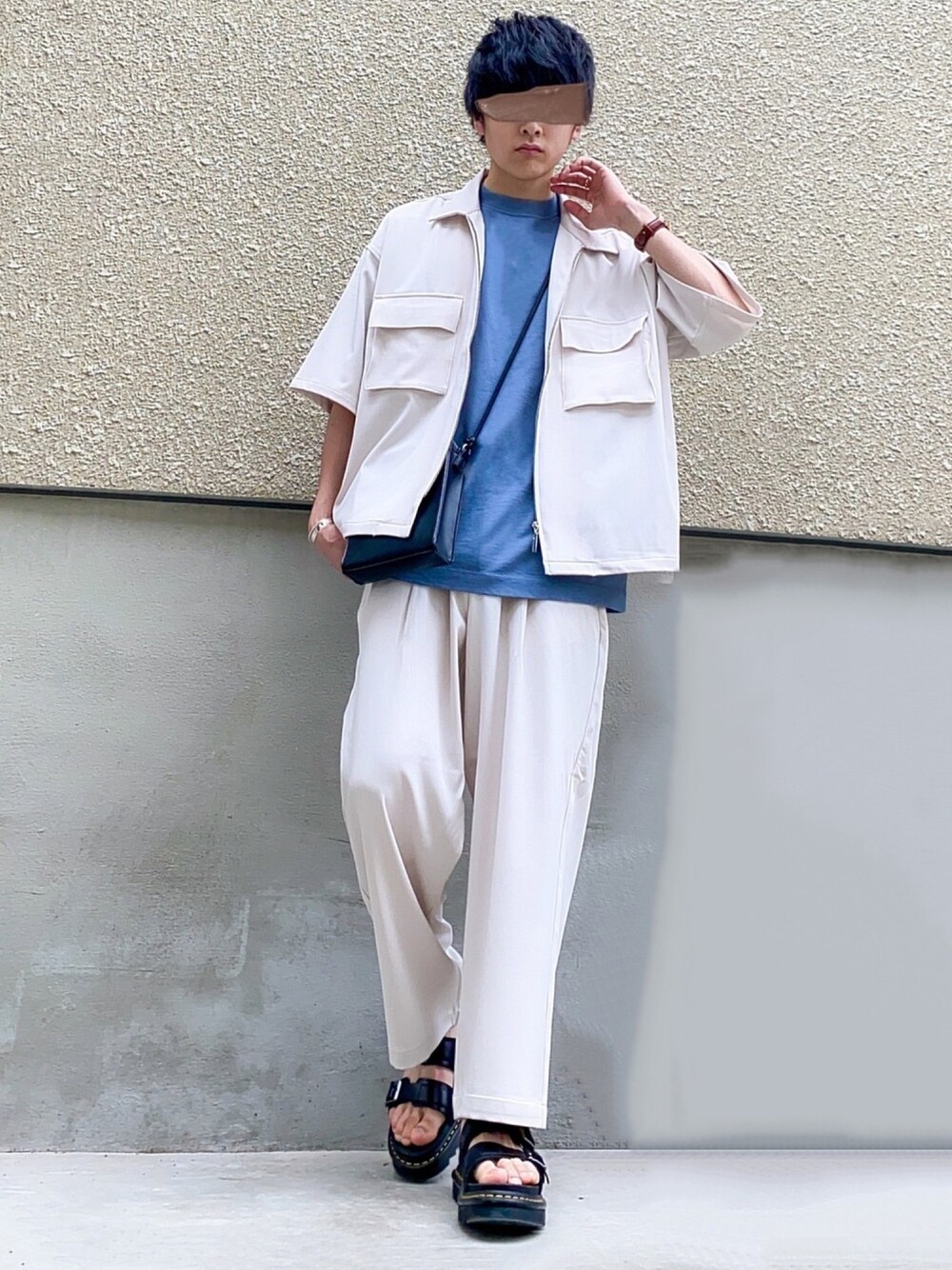 Tenshinのセットアップ「【セットアップ 2点セット】ポリトロストレッチドレープリラクシング半袖ビッグポケットジップシャツ+ワイドパンツ」を使ったコーディネート
