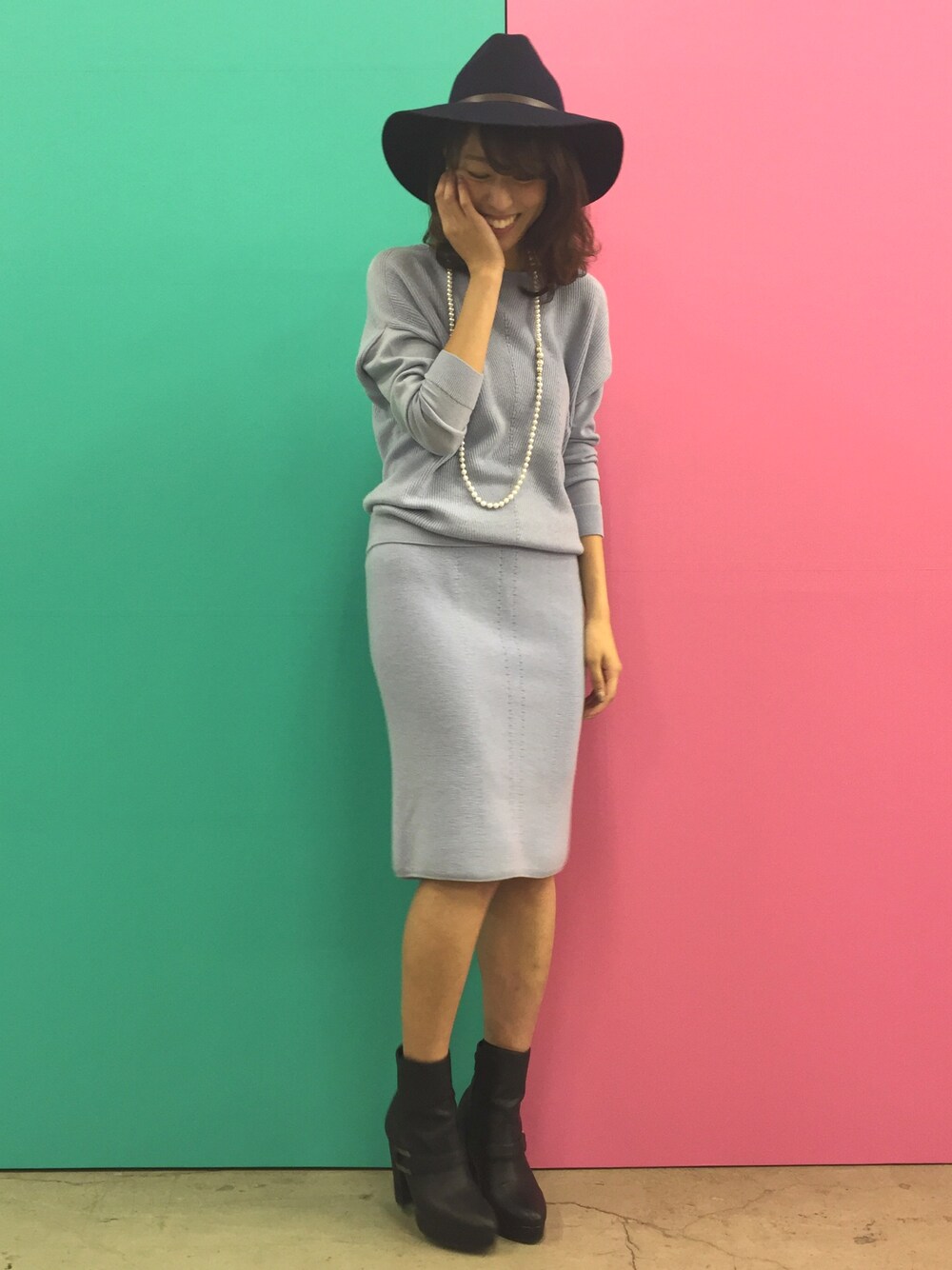 トレンドのニットセットアップもペールブルーなら着やすくて◎💗 縫い目のないホールガーメントで着心地抜群〜🙌🏻 ハット合わせでちょっぴりおめかししちゃいましょ❄️