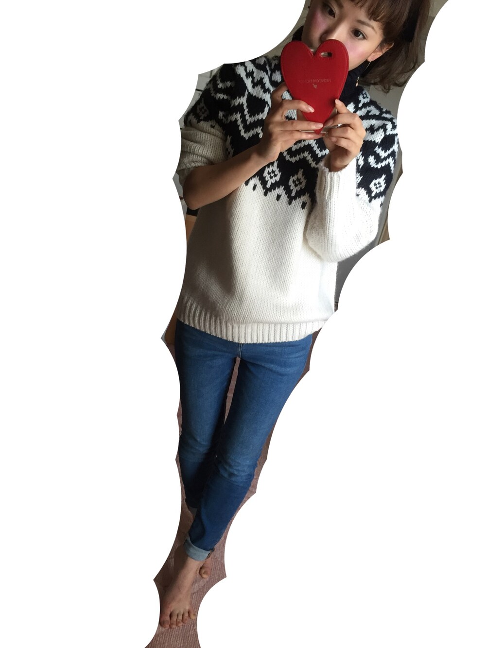 ホワイト系のニット/セーター、ブルー系のデニムパンツ、ブラック系のヘアゴムを着用したレディースの秋コーディネートの1枚目の写真
