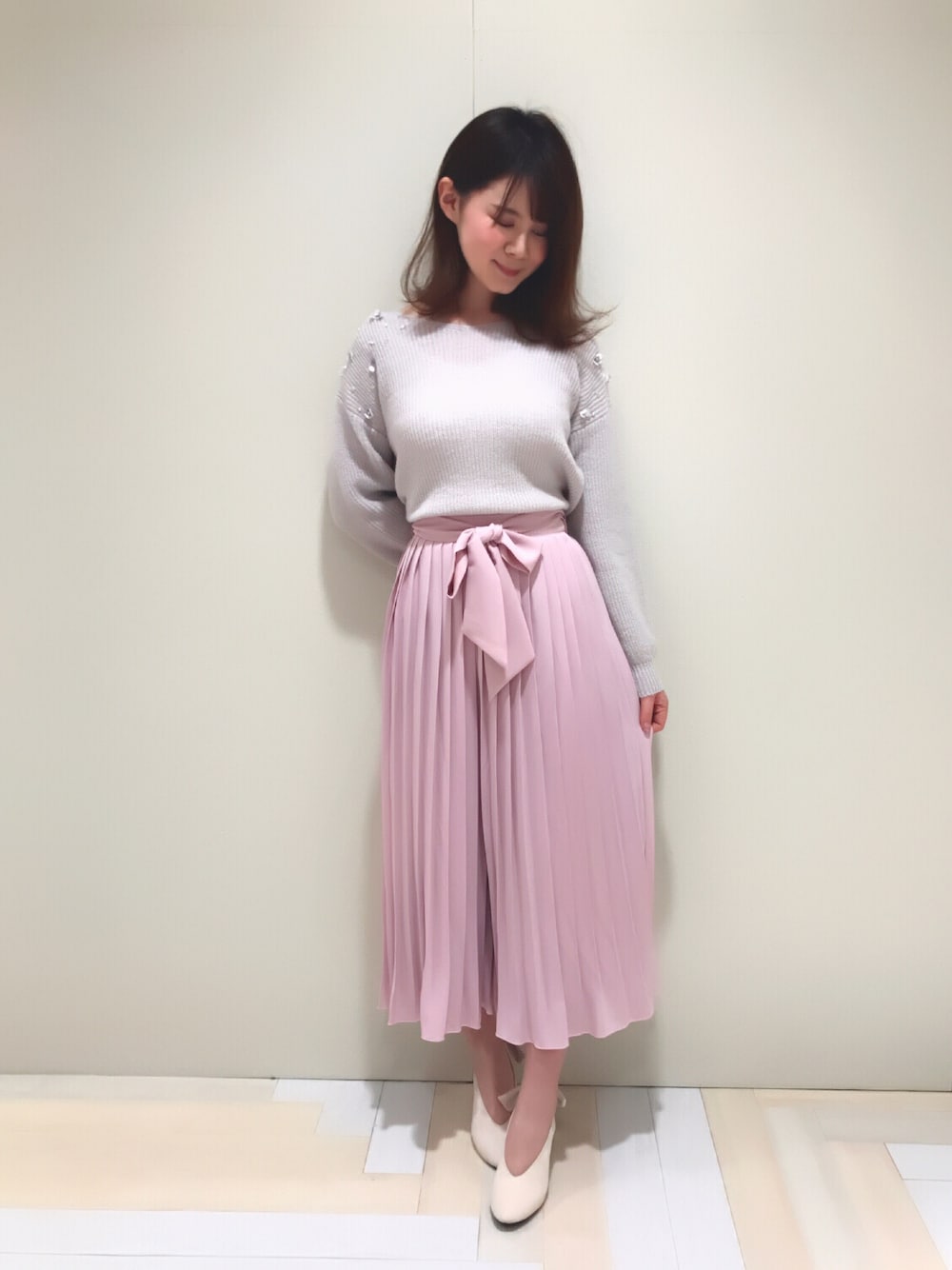 ビジュー付きのニットと プリーツスカンツのコーデです❤️ 裾までプリーツ加工してないので カッチリとなりすぎずふんわりと着ていただけます🤗